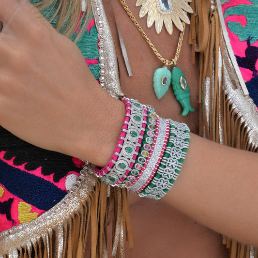 Toujours fabriqués en argent massif, ces bracelets sont plus légers, plus ouverts dans leur conception et sertis de moissanite, une pierre brillante qui scintille et brille comme un diamant. Le résultat est une interprétation fraîche et moderne de l'esprit Van den Abeele : colorée, joyeuse et naturellement chic.