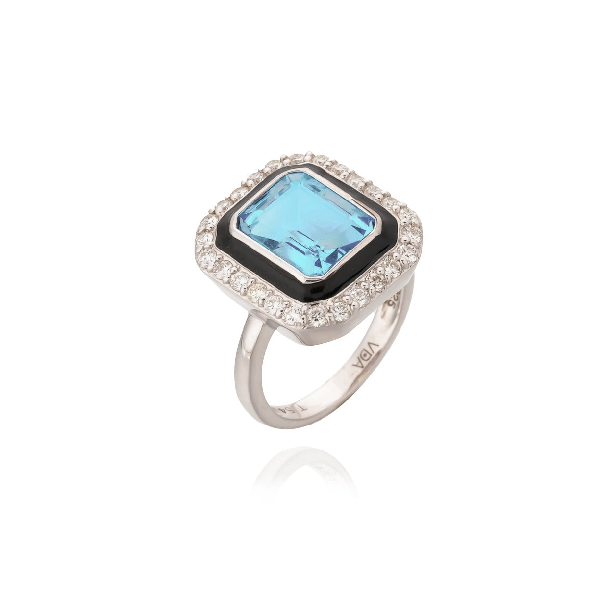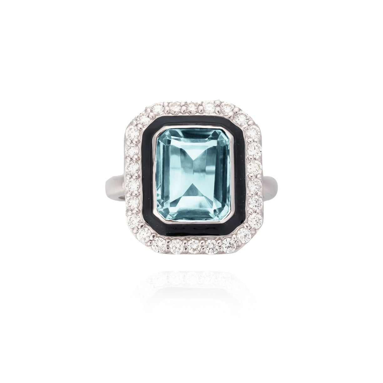 Art deco-inspired ring in 925 Silver adorned with an emerald-cut Topaz , set with diamonds and enhanced with black enamel .