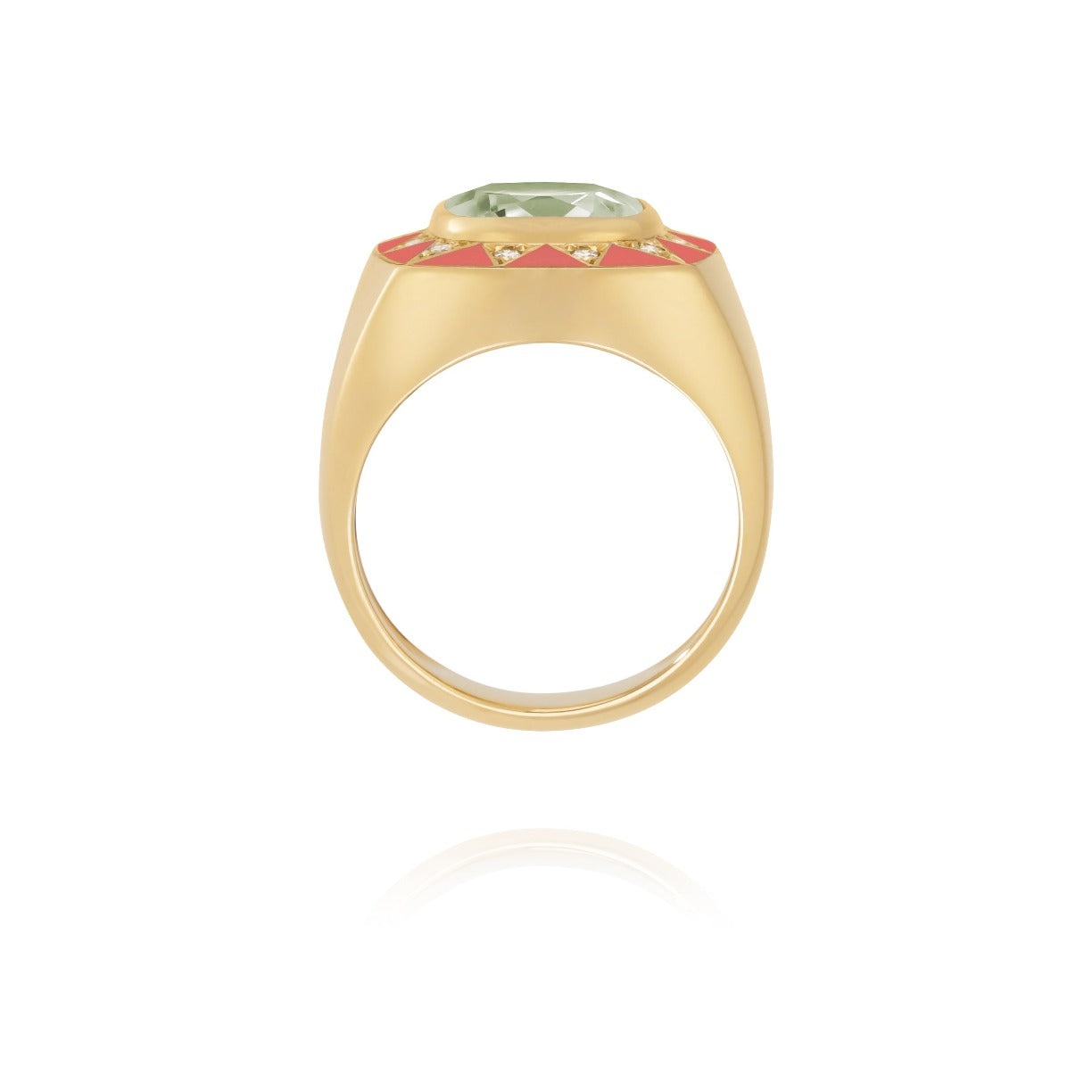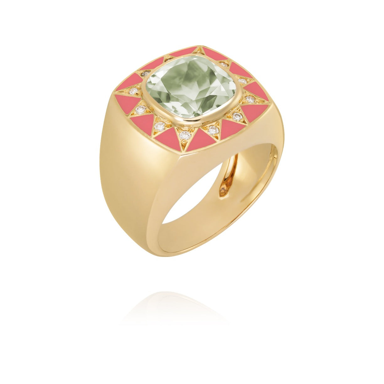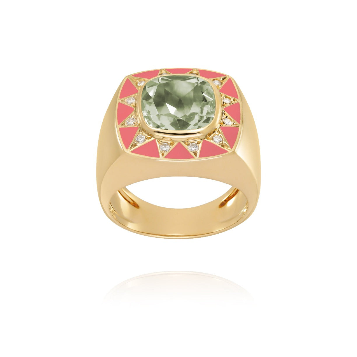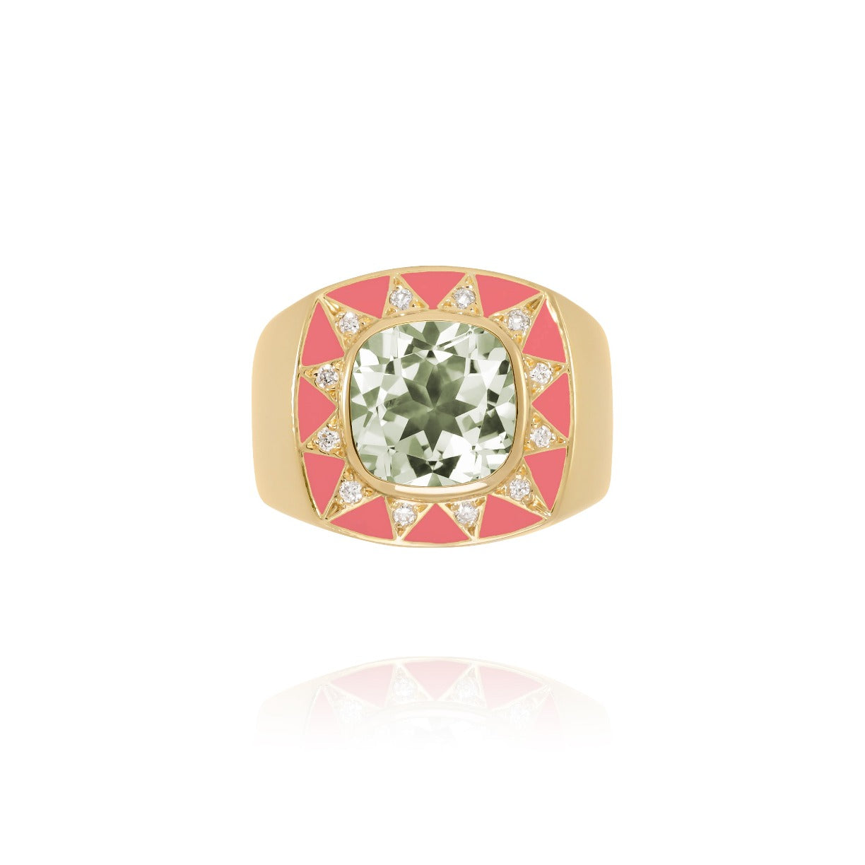 18-carat gold ring in the shape of a bangle or imposing signet ring, adorned in its center with a splendid green Amethsyt, radiating like a star decorated with diamonds set in a triangle and neon coral pink enamel .