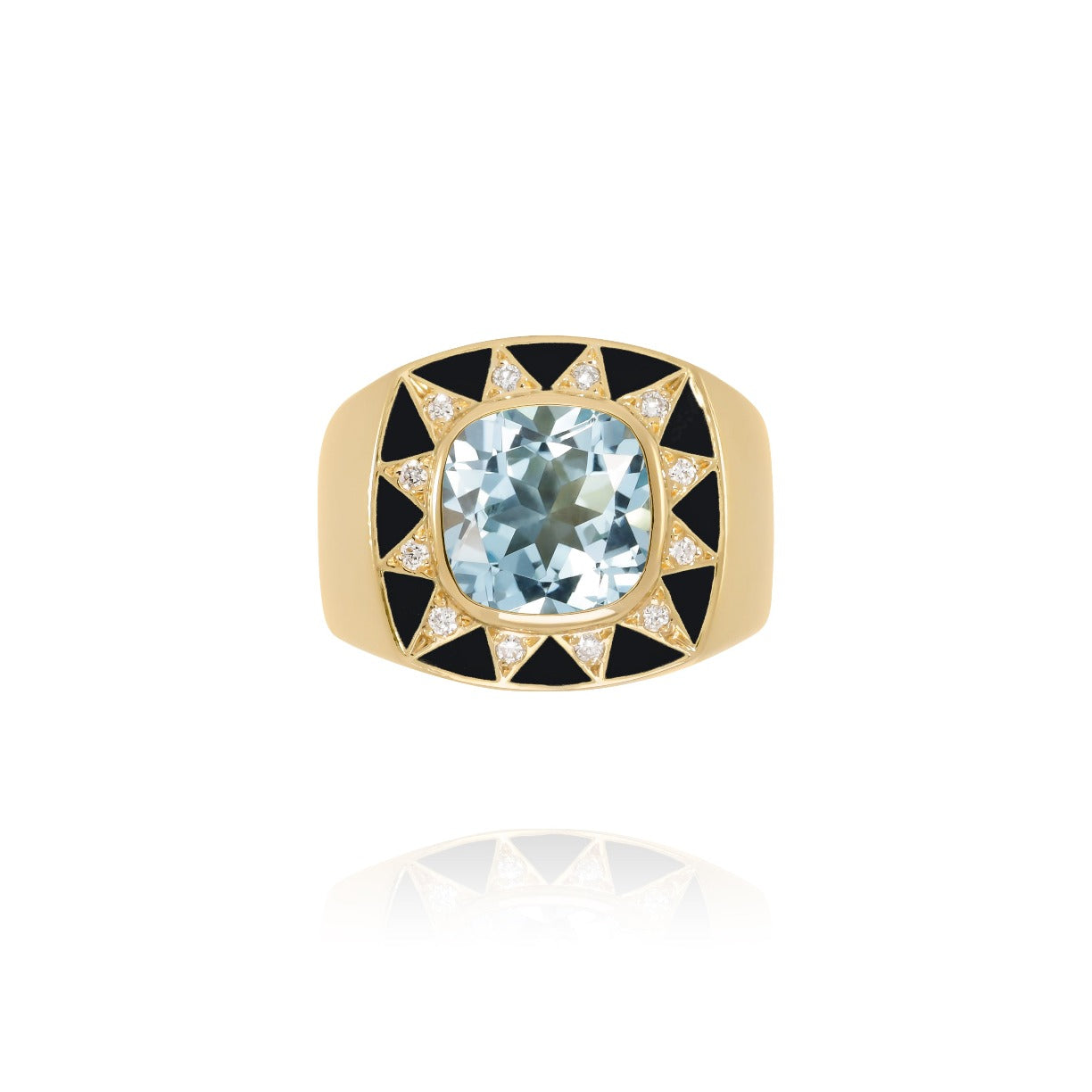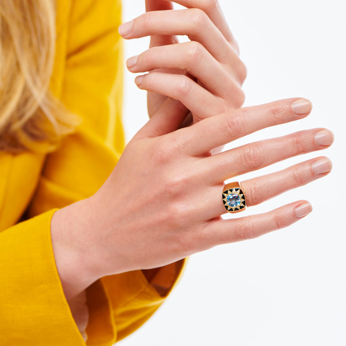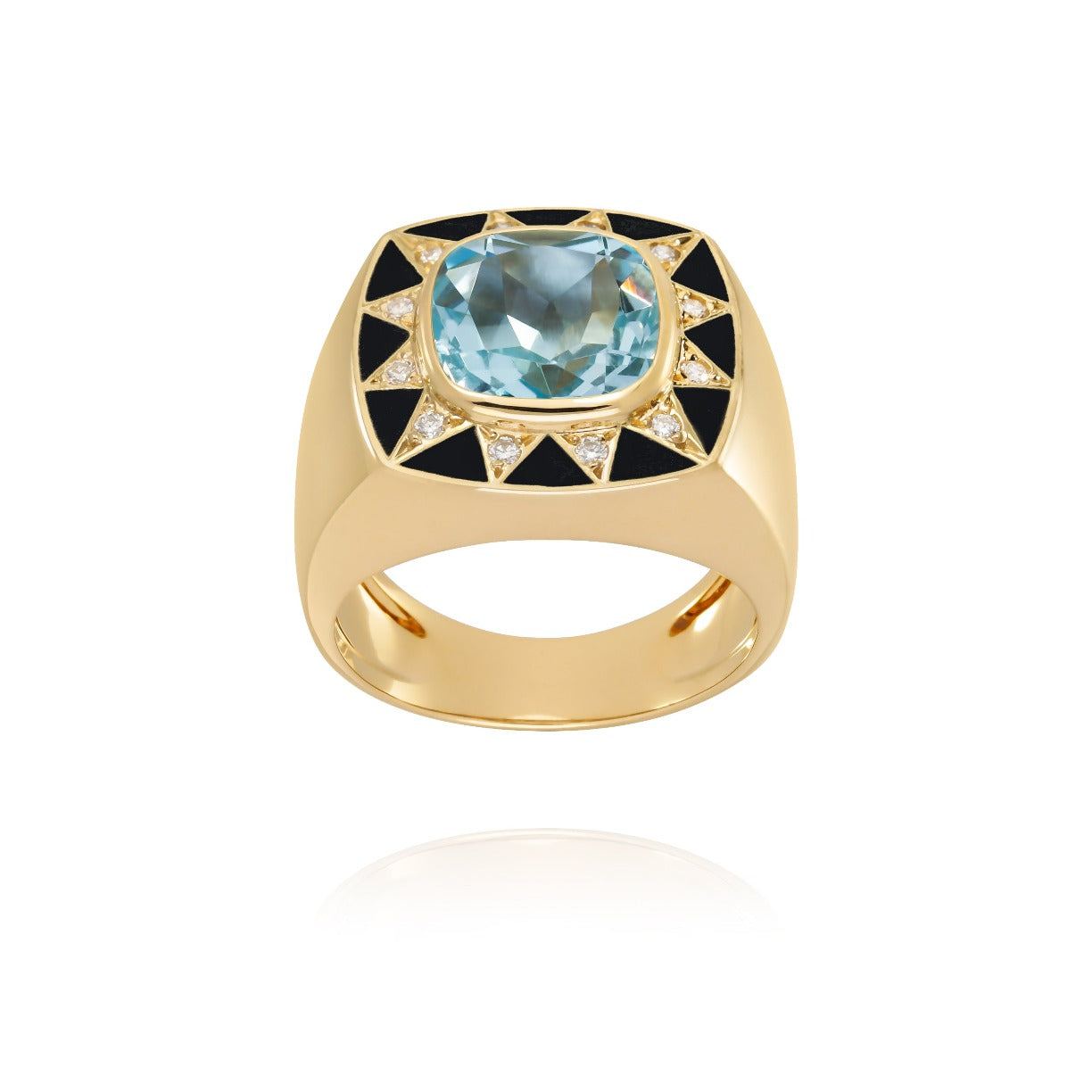 18k gold ring in the shape of a bangle or imposing signet ring, adorned in its center with a Blue Sky Topaz radiating like a star decorated with diamonds set in a triangle and black enamel .
