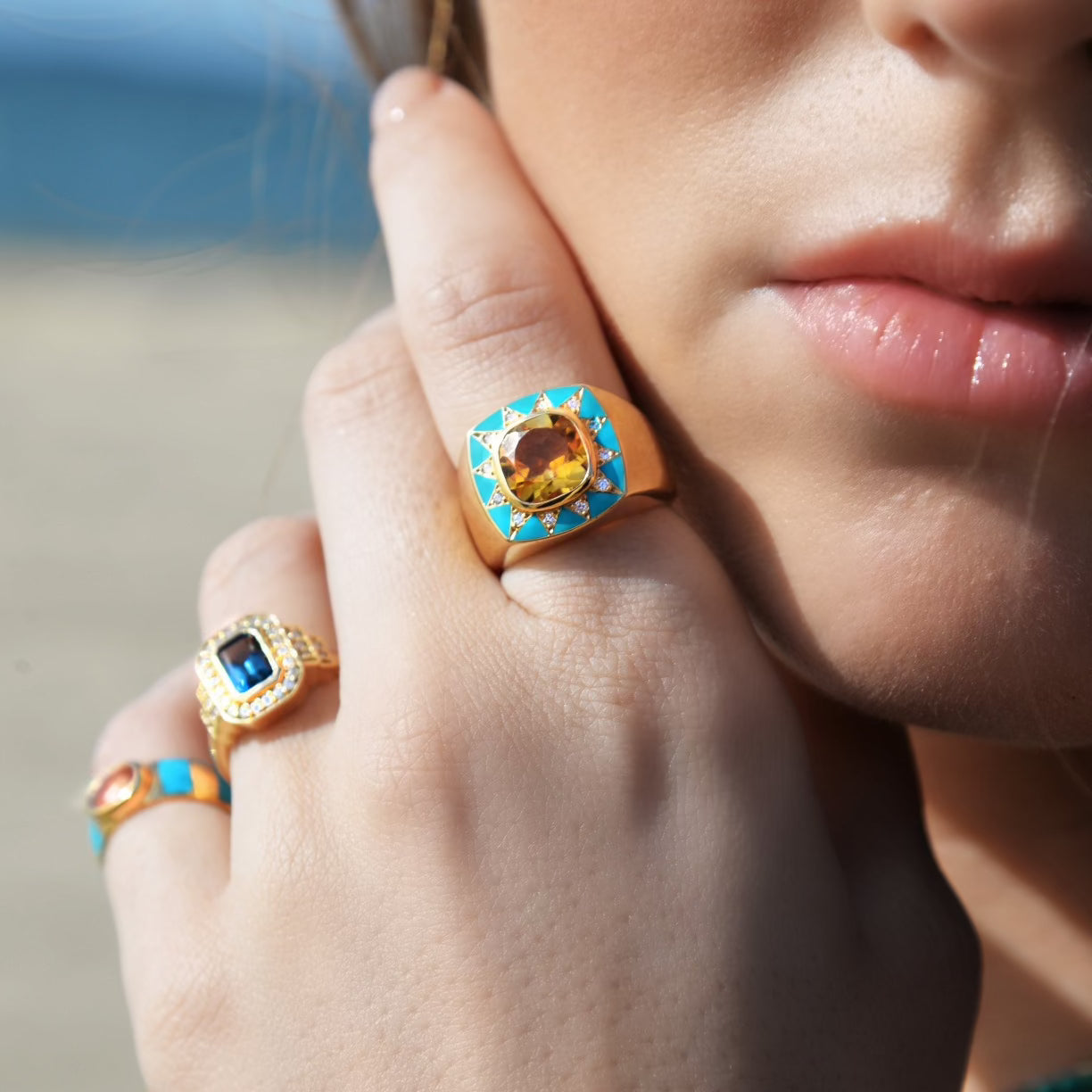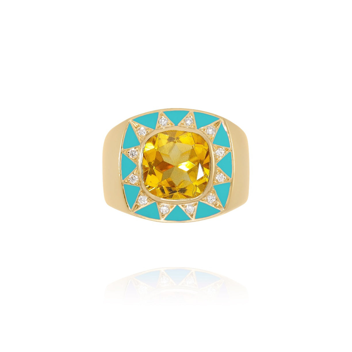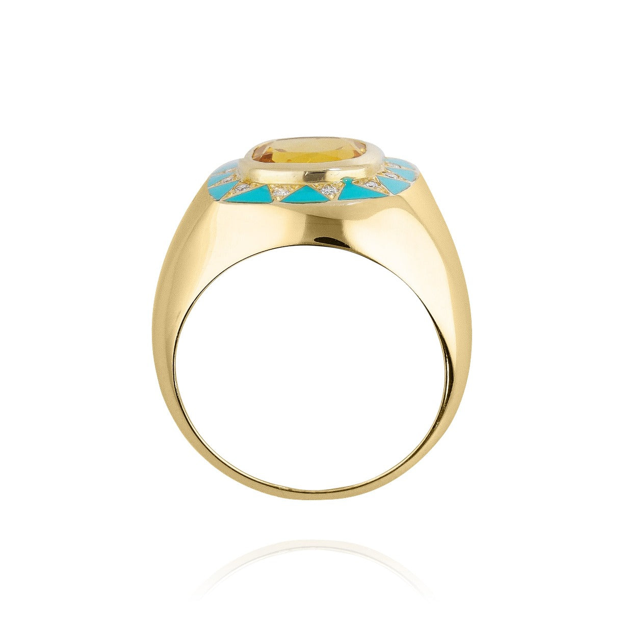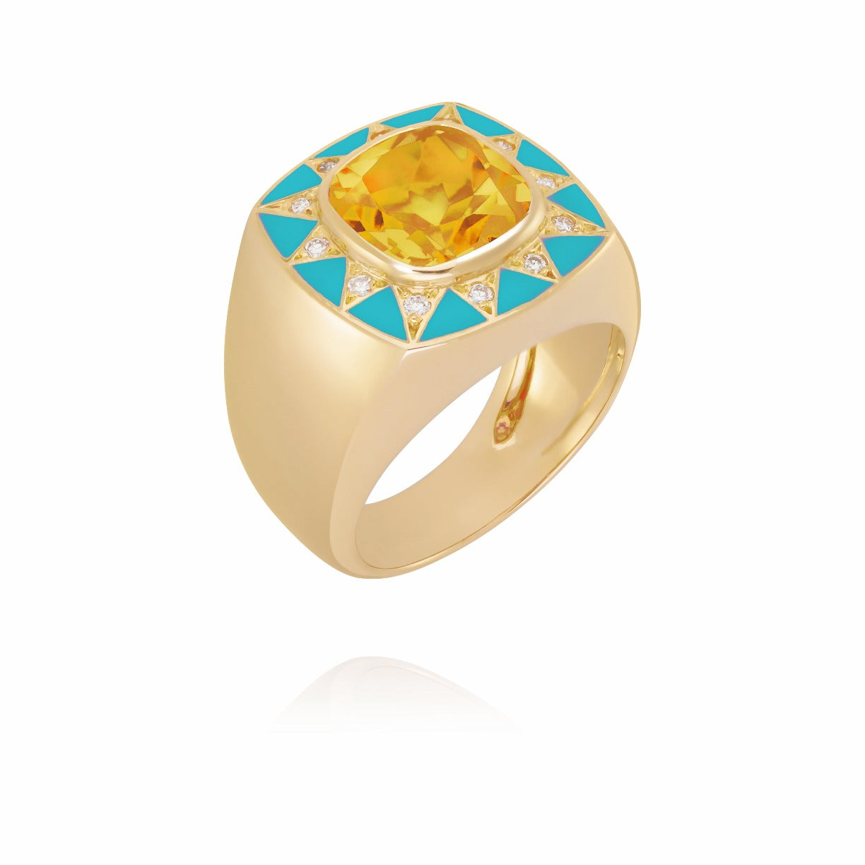 18-carat gold ring in the shape of a bangle or imposing signet ring, decorated in its center with a Madeira Citrine , radiating like a star decorated with diamonds set in a triangle and turquoise enamel .