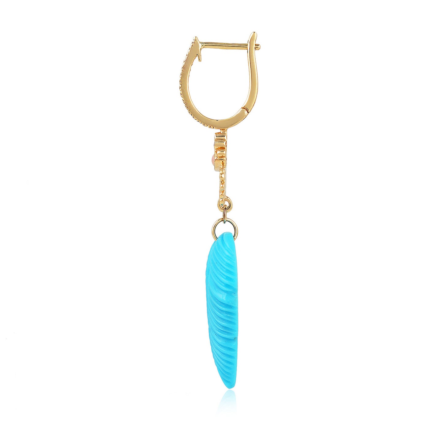 Fine 14k yellow gold earring representing a delicate turquoise feather, paved with diamonds and enhanced by a splendid opal. Sold individually. Can be worn in pairs.