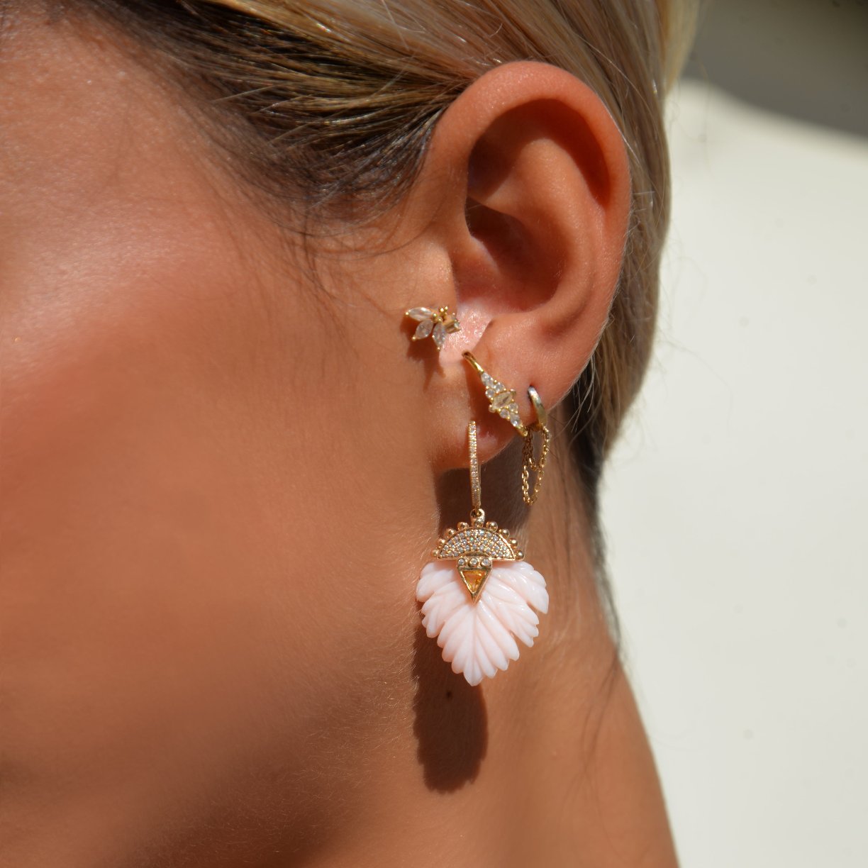 Yellow gold 14k earring, pink opal, citrine and diamonds. Sold individually. Can be worn as a pair.