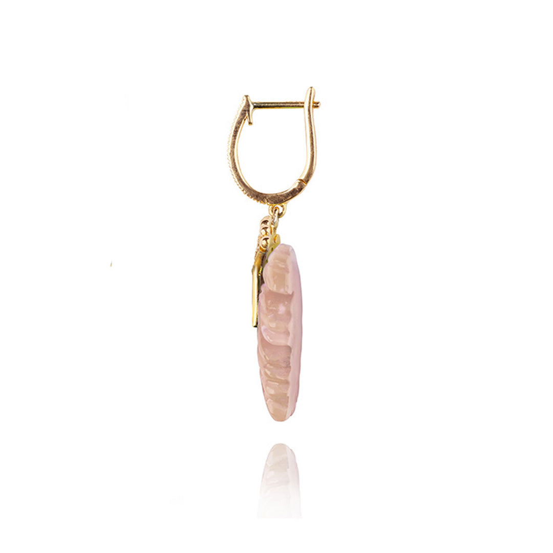 A finely worked loop in the shape of a petal. Made of 14-carat yellow gold, this hand-carved pink opal coin is beautifully enhanced with a citrine and set with diamonds. Sold as a unit.