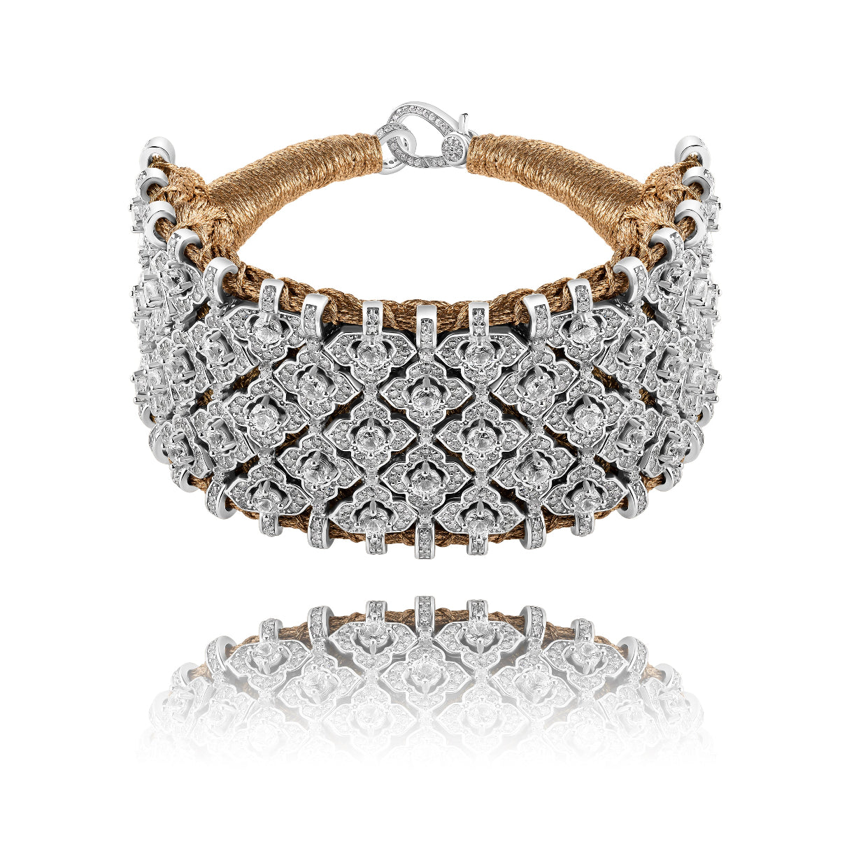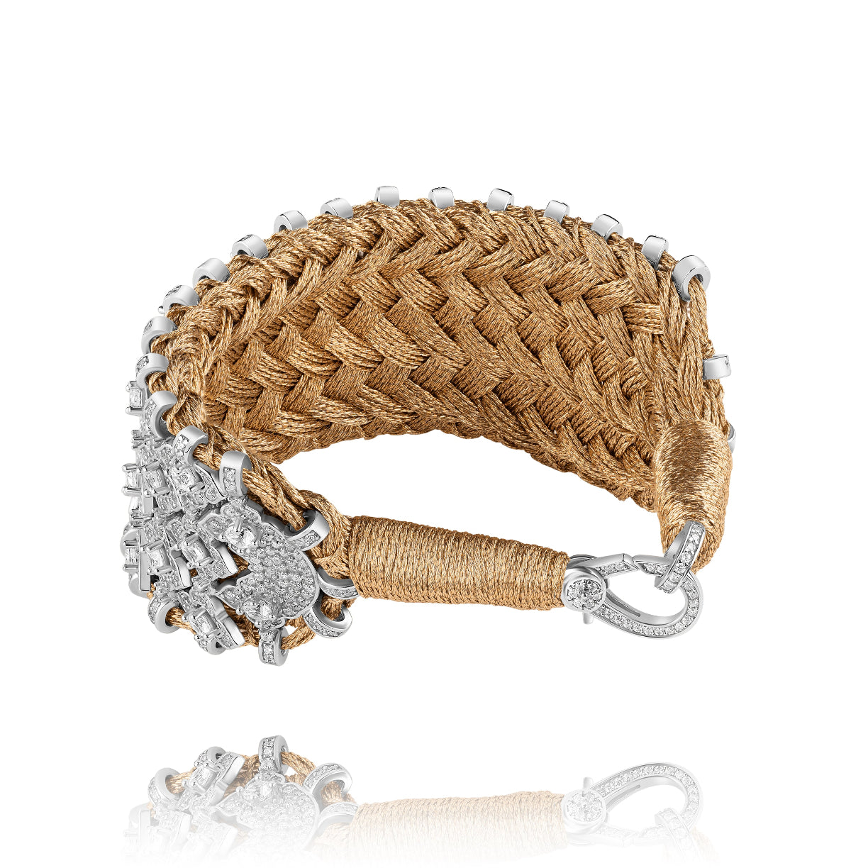 Large brass braided lurex wire cuff decorated with a 925 silver structure entirely paved with diamonds and zircons.