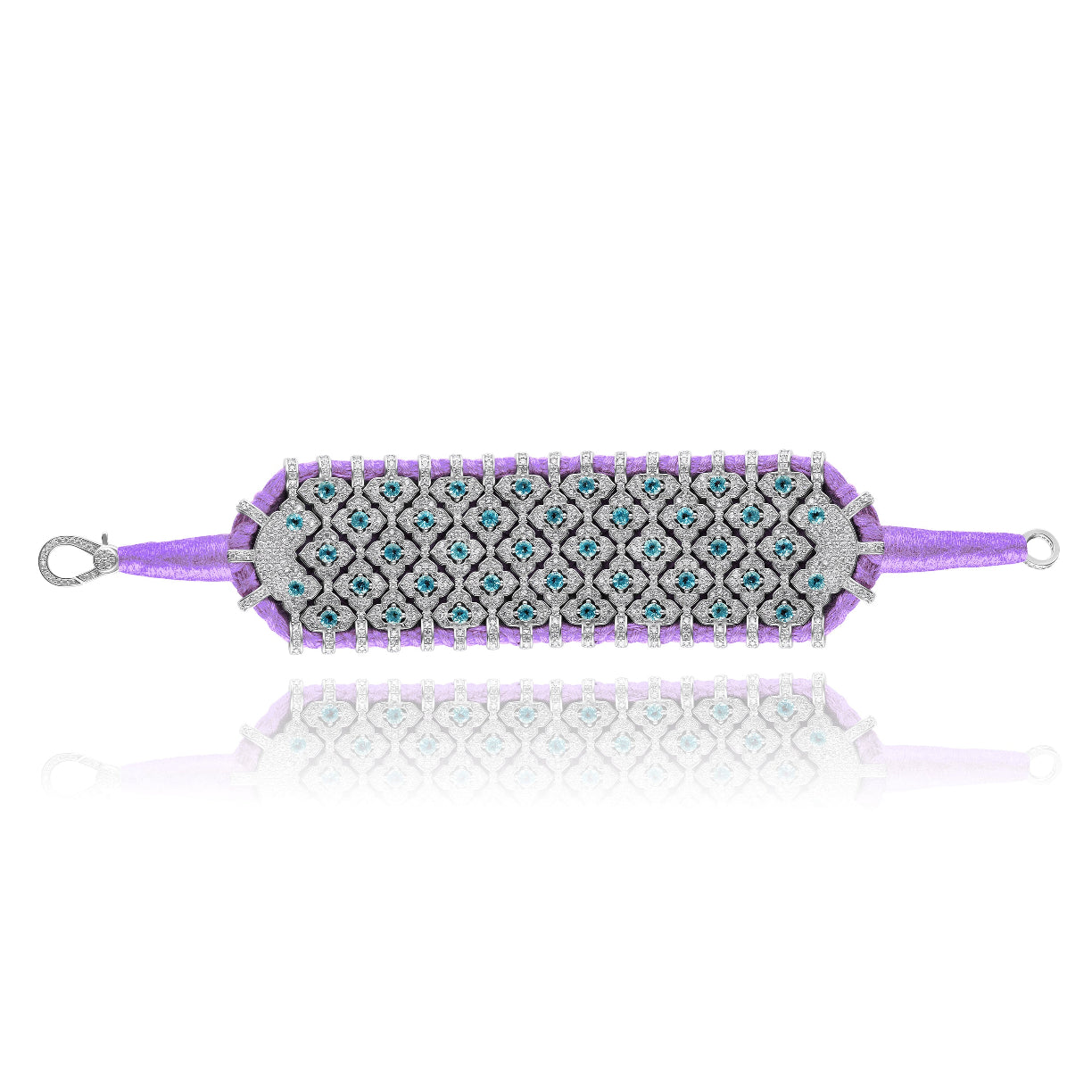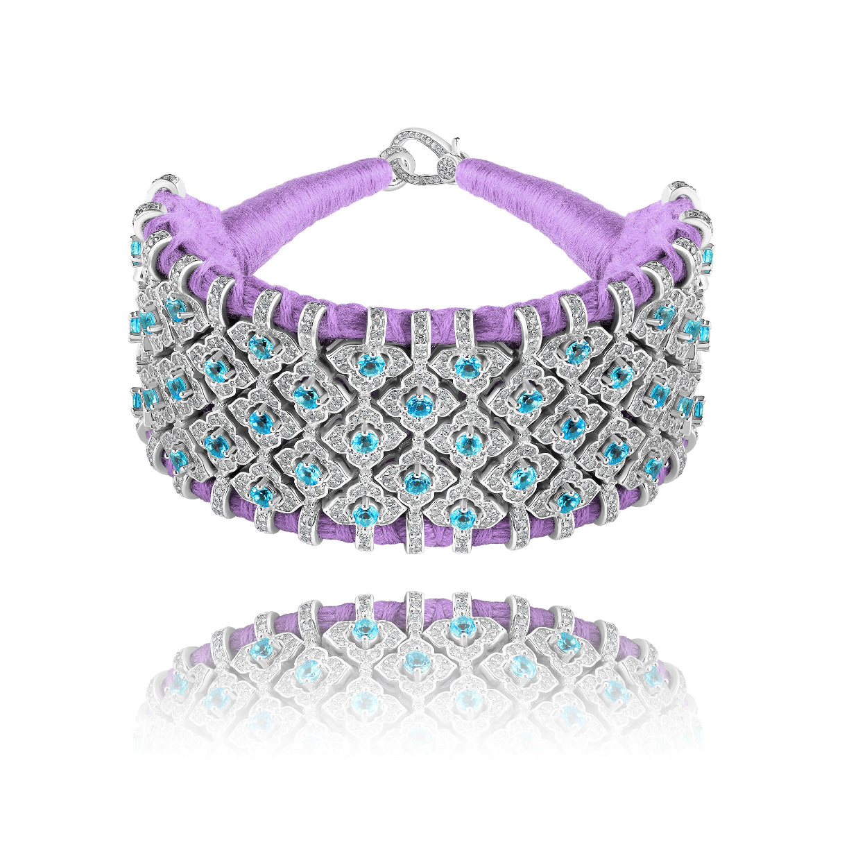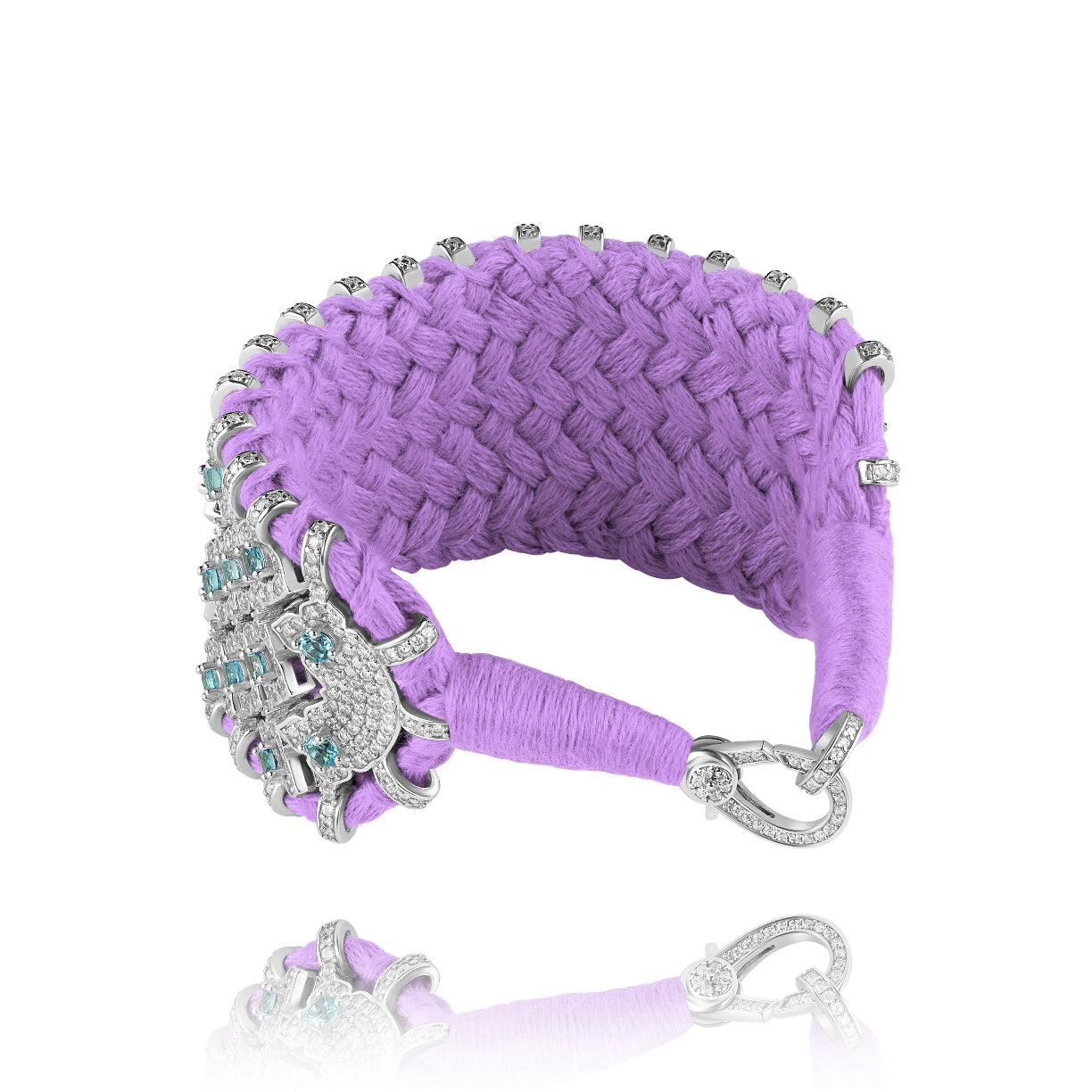 Large cuff in lilac braided cotton thread decorated with a 925 silver structure entirely paved with diamonds and topaz stones.