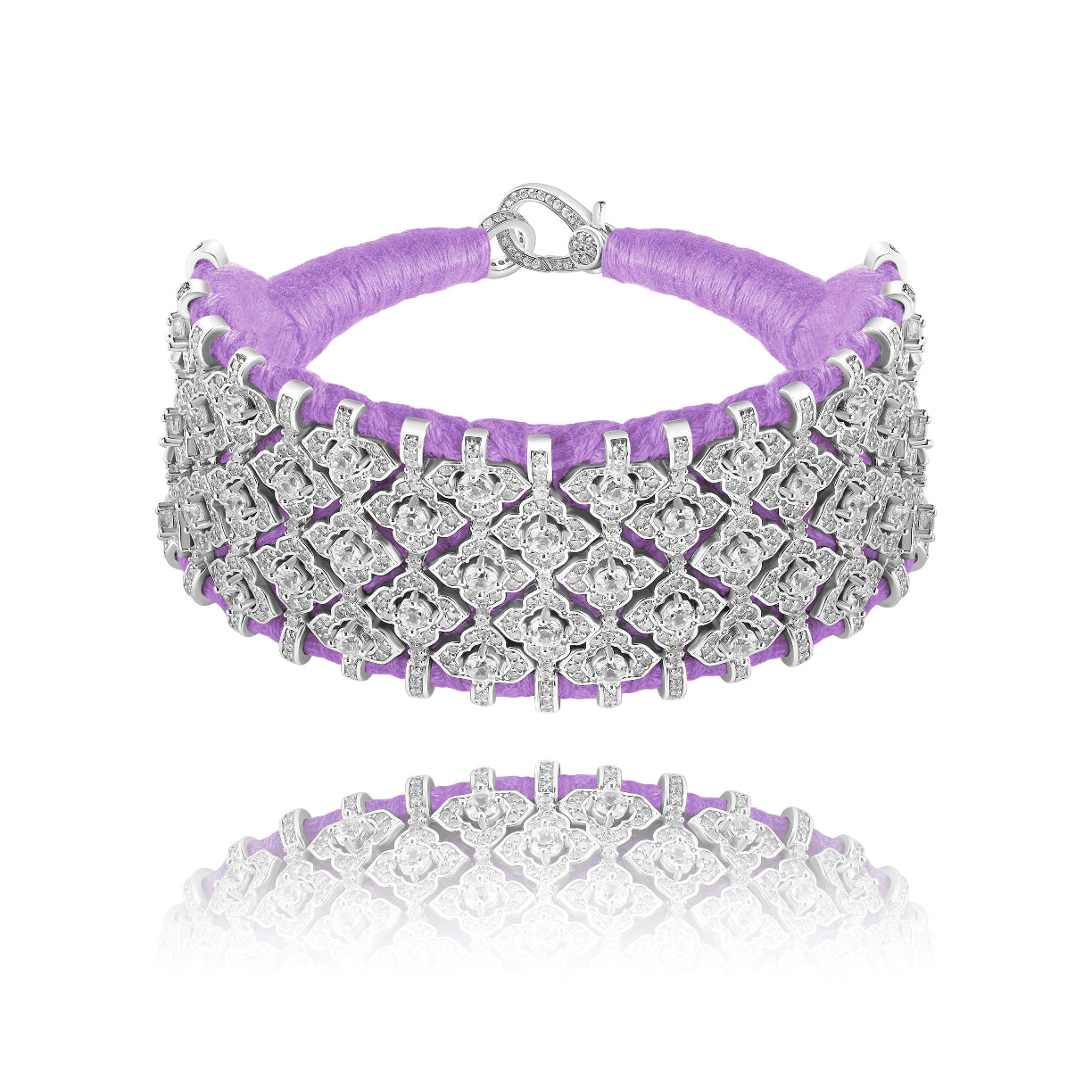 Large lilac braided cotton wire cuff decorated with a 925 silver structure entirely paved with diamonds and zircons.