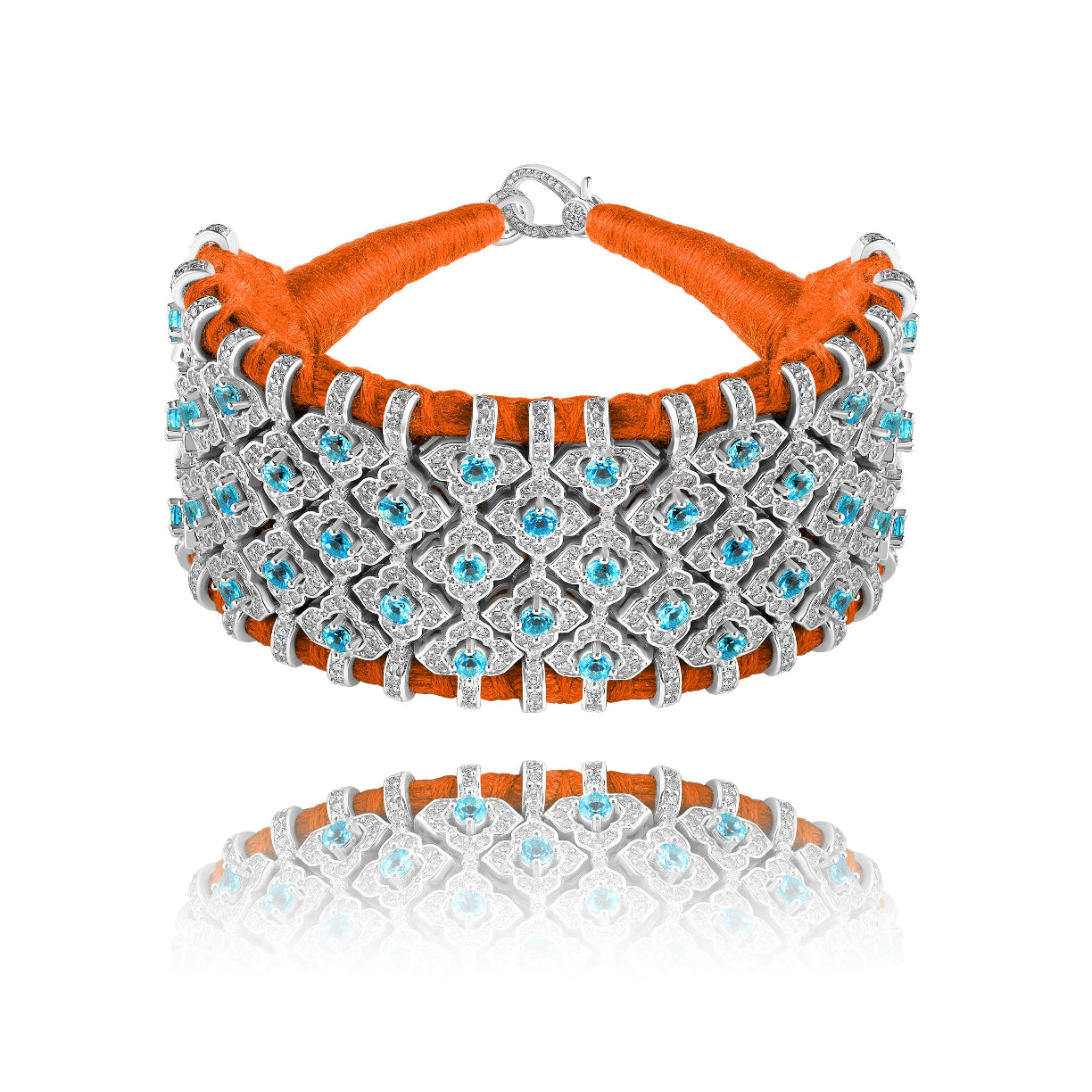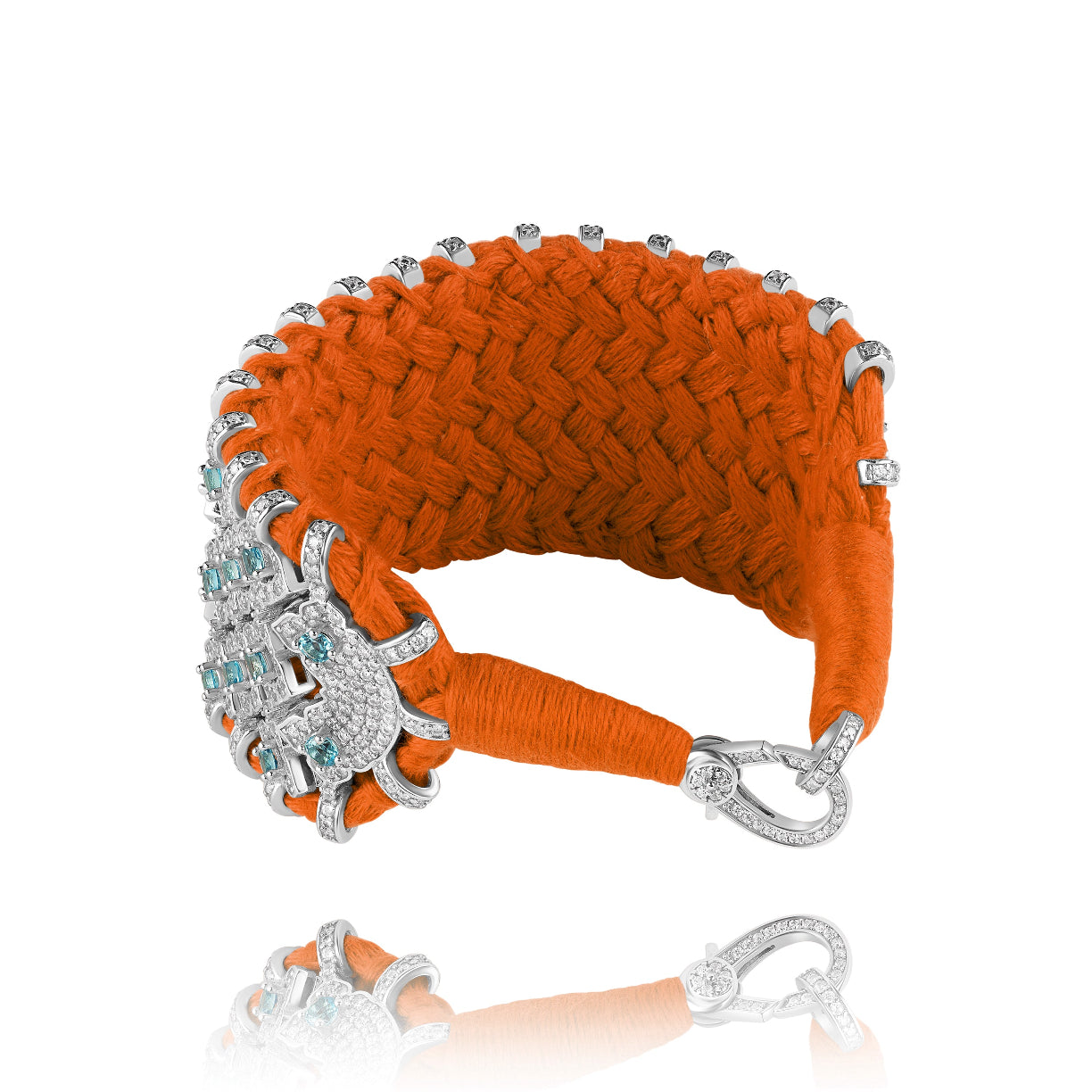 Large cuff in orange braided cotton thread decorated with a 925 silver structure entirely paved with diamonds and topaz stones.