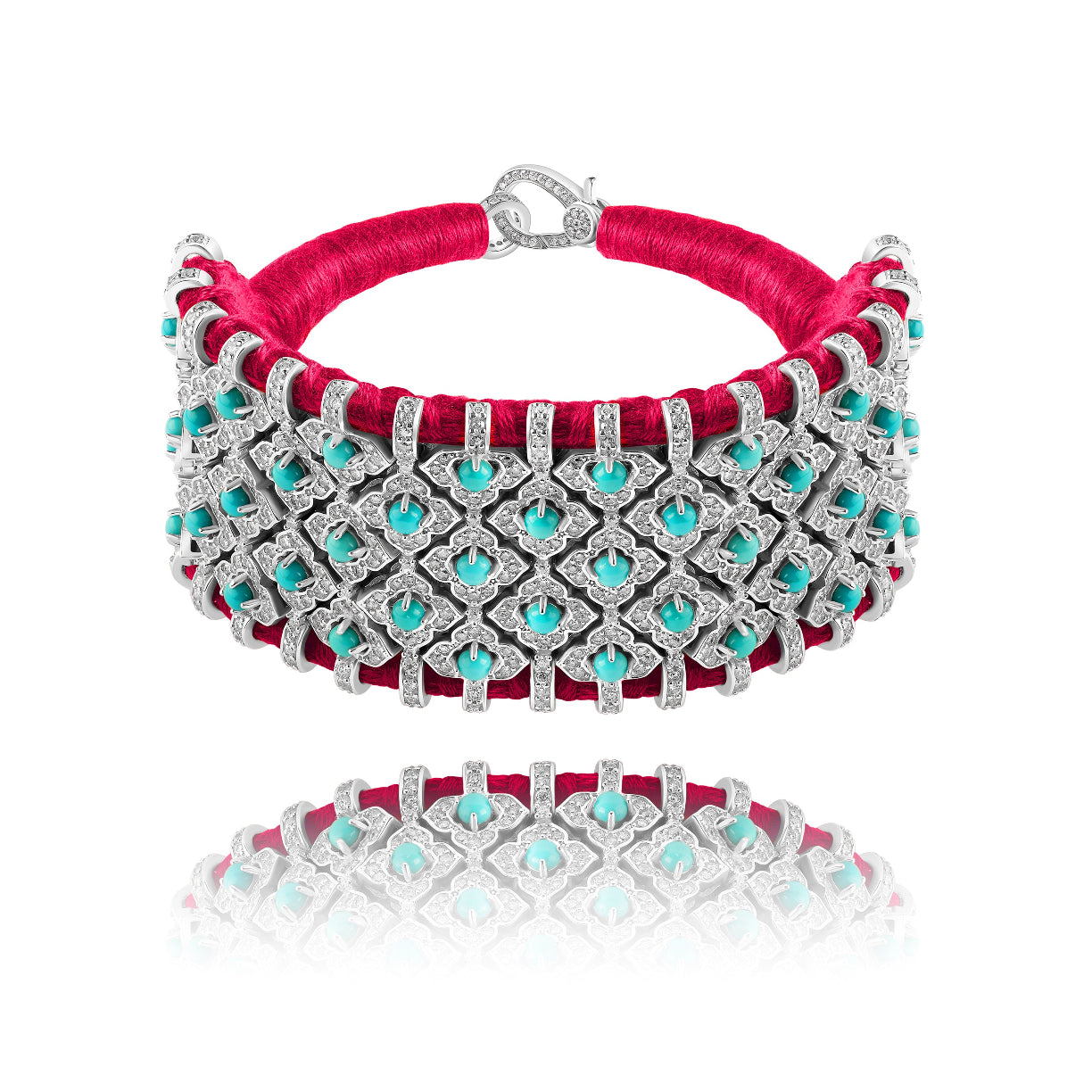 Large cuff in rani-coloured braided cotton thread decorated with a 925 silver structure entirely paved with diamonds and turquoise stones.