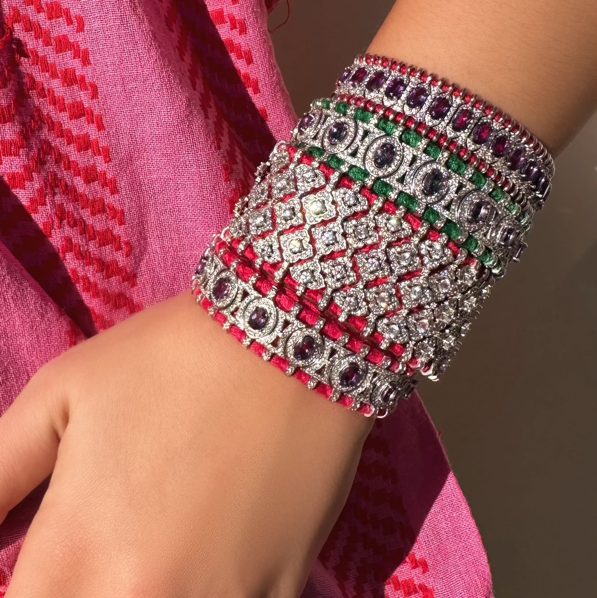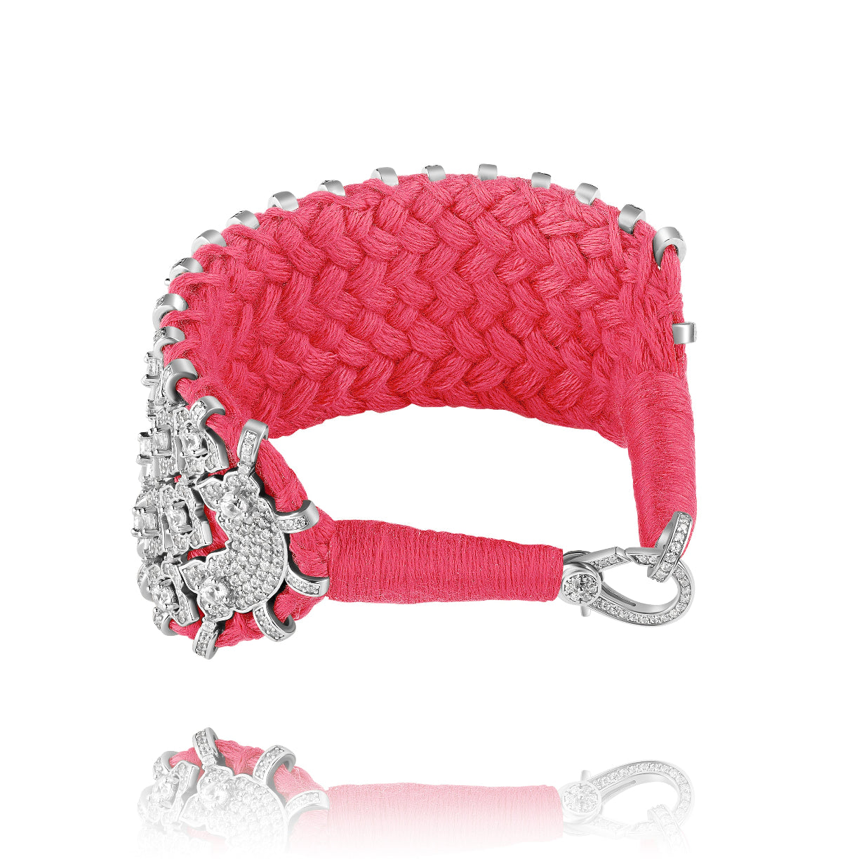 Large rani braided cotton wire cuff decorated with a 925 silver structure entirely paved with diamonds and zircons.