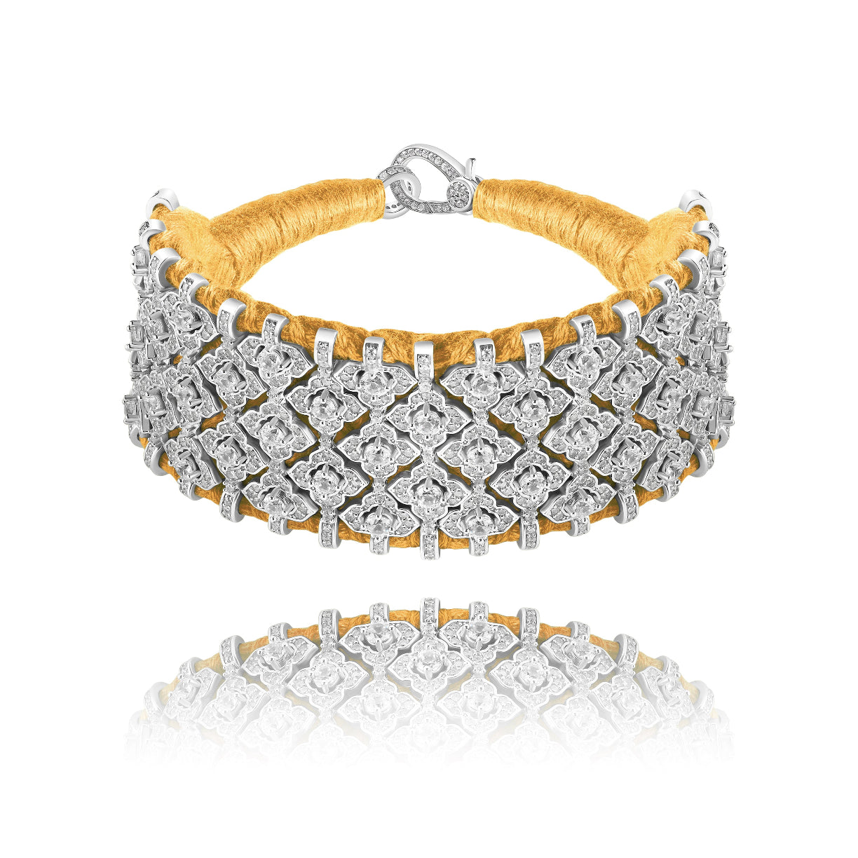 Large saffron braided cotton wire cuff decorated with a 925 silver structure entirely paved with diamonds and zircons.
