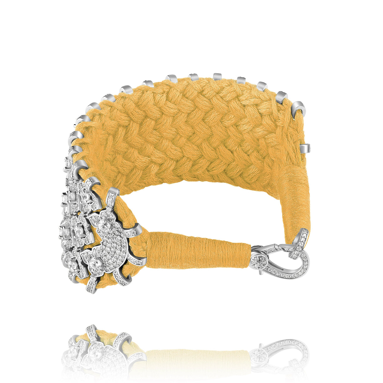 Large saffron braided cotton wire cuff decorated with a 925 silver structure entirely paved with diamonds and zircons.