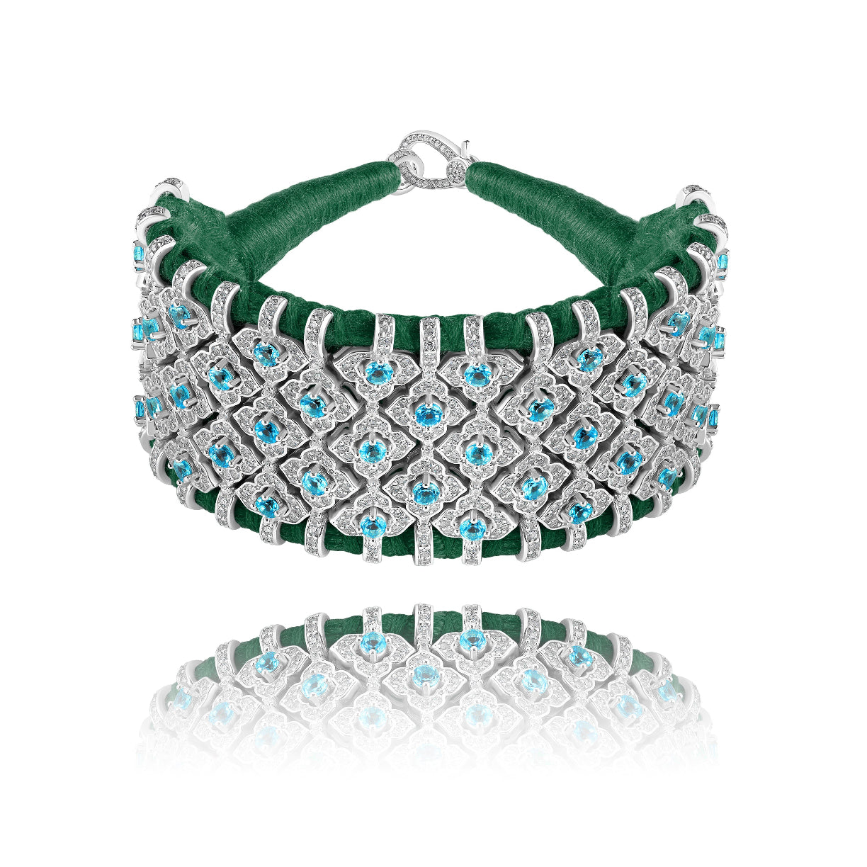 Large cuff in fir-tree braided cotton thread decorated with a 925 silver structure entirely paved with diamonds and topaz stones.