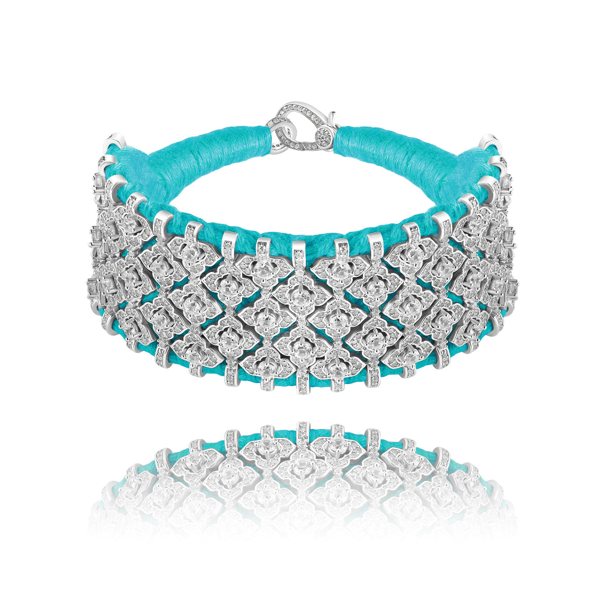 Large turquoise braided cotton wire cuff decorated with a 925 silver structure entirely paved with diamonds and zircons.