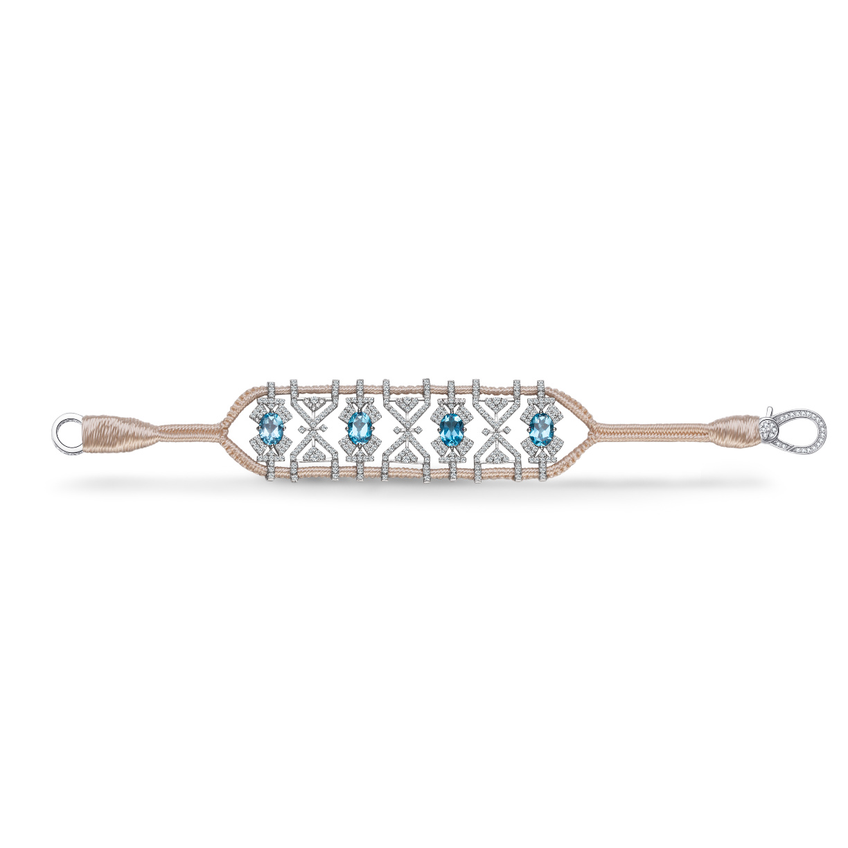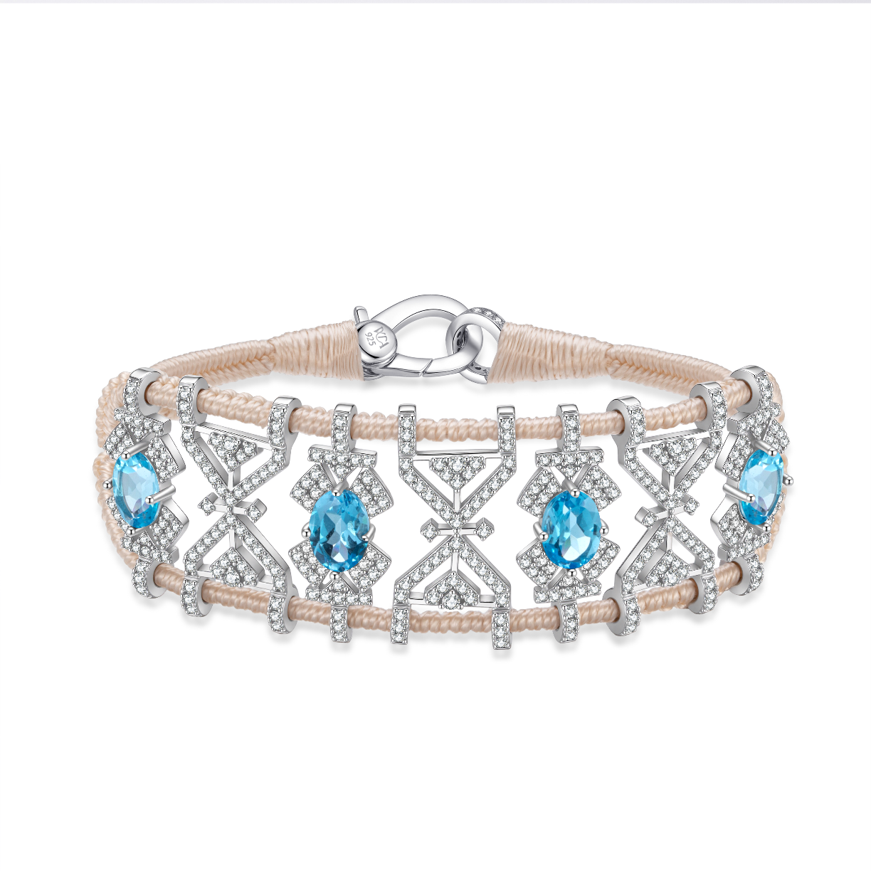 Vanilla color braided cotton bracelet adorned with a 925 silver motif entirely paved with moissanites and enhanced with blue Swiss Topazes. Choose a size 1 cm larger than your wrist measurement.