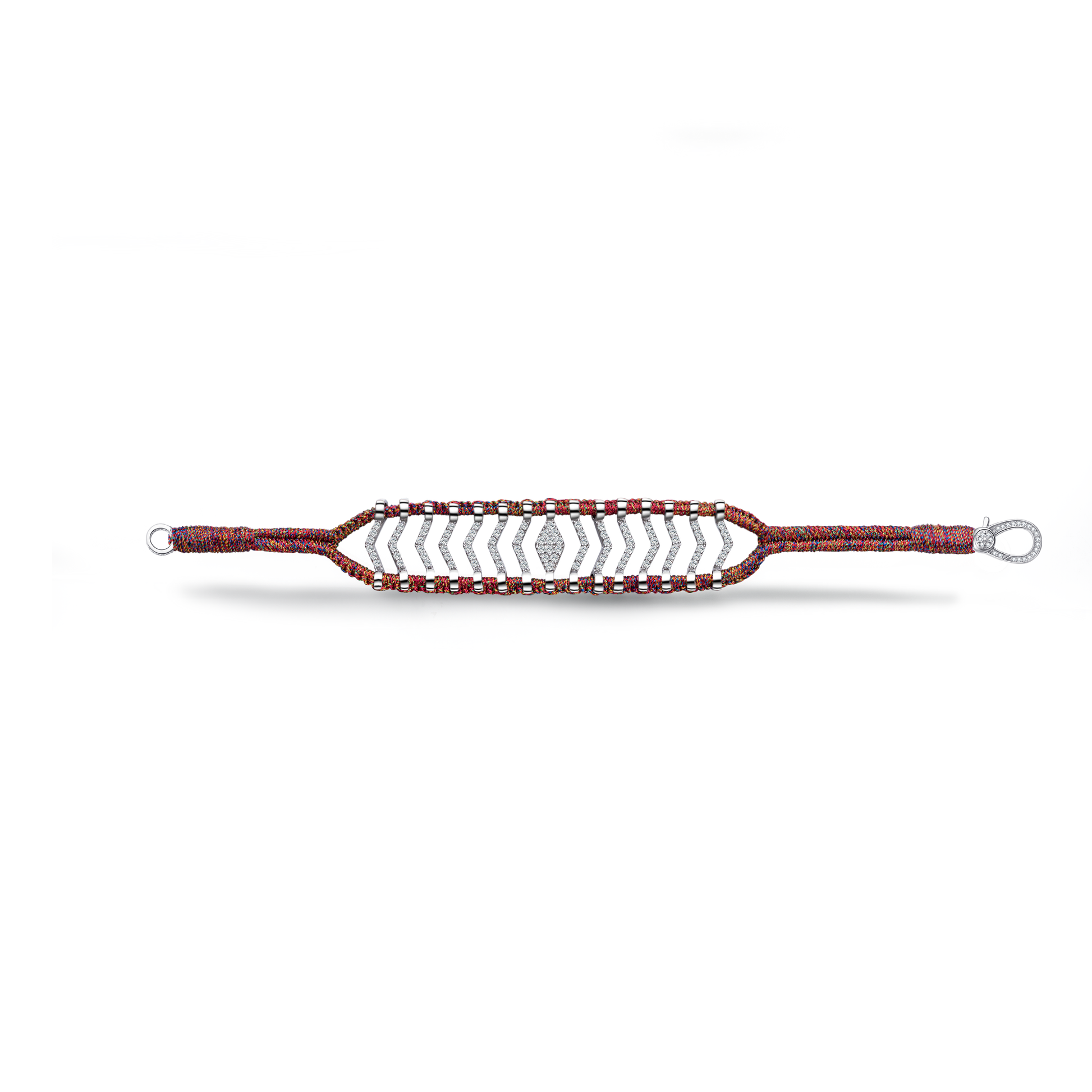Fine bracelet made of Red Shanti color braided lurex thread, decorated with a 925 silver pattern and set with moissanites.