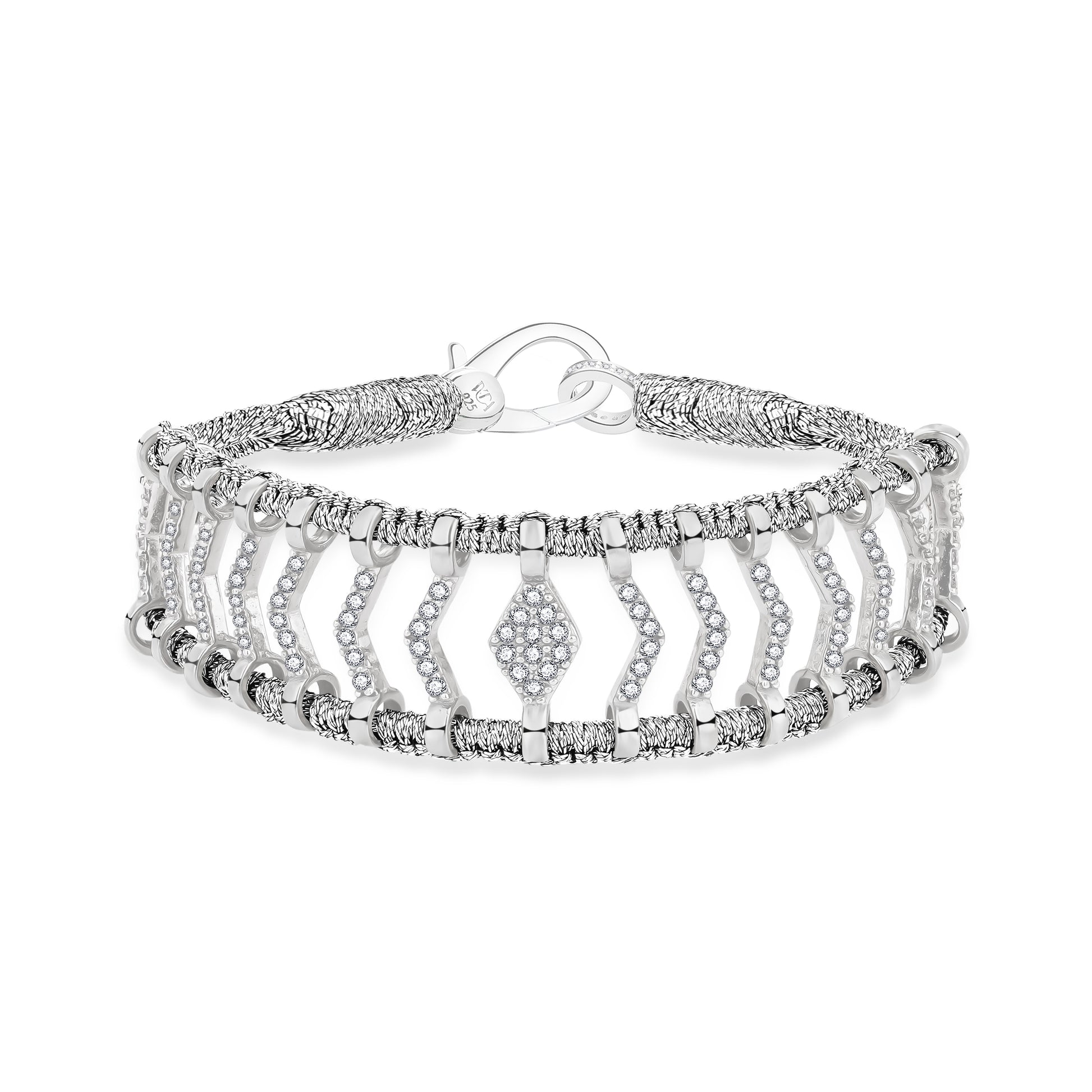 Fine bracelet made of silver braided lurex thread, decorated with a 925 silver pattern and set with moissanites.