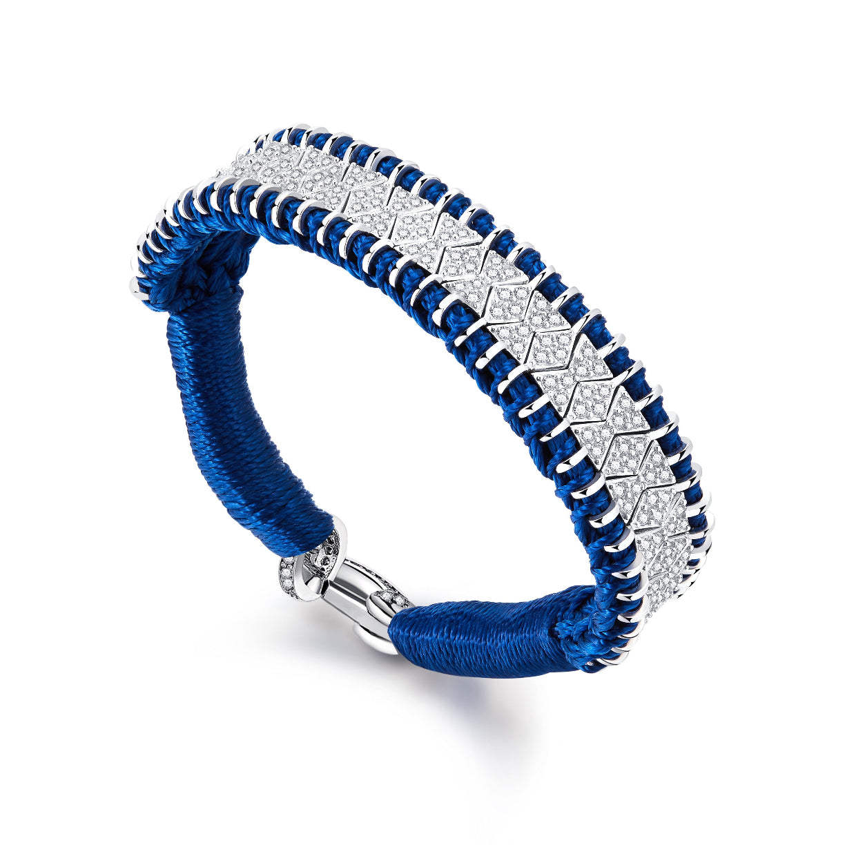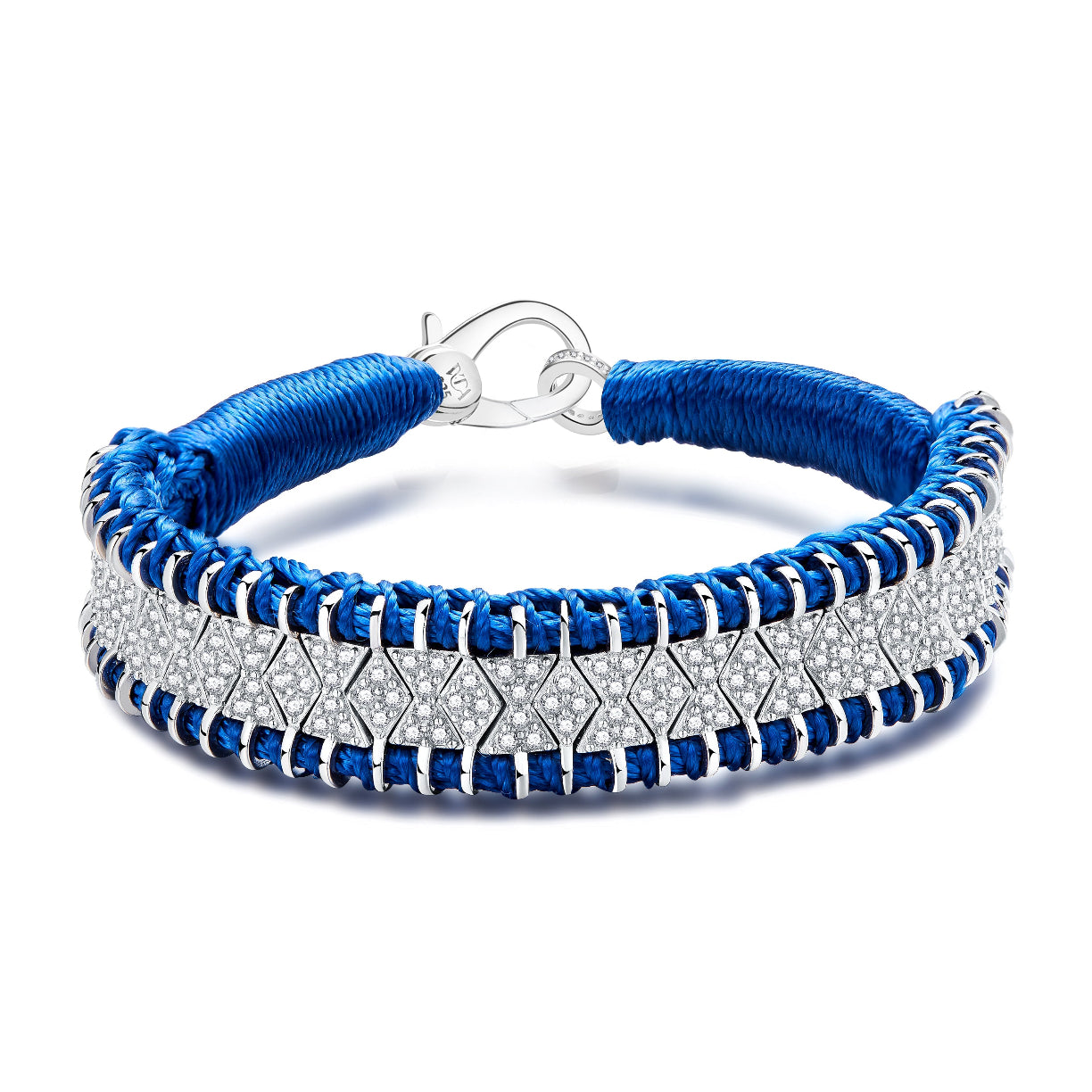 Bracelet in braided cotton thread in royal blue color , decorated with a 925 silver motif and set with a multitude of diamonds.