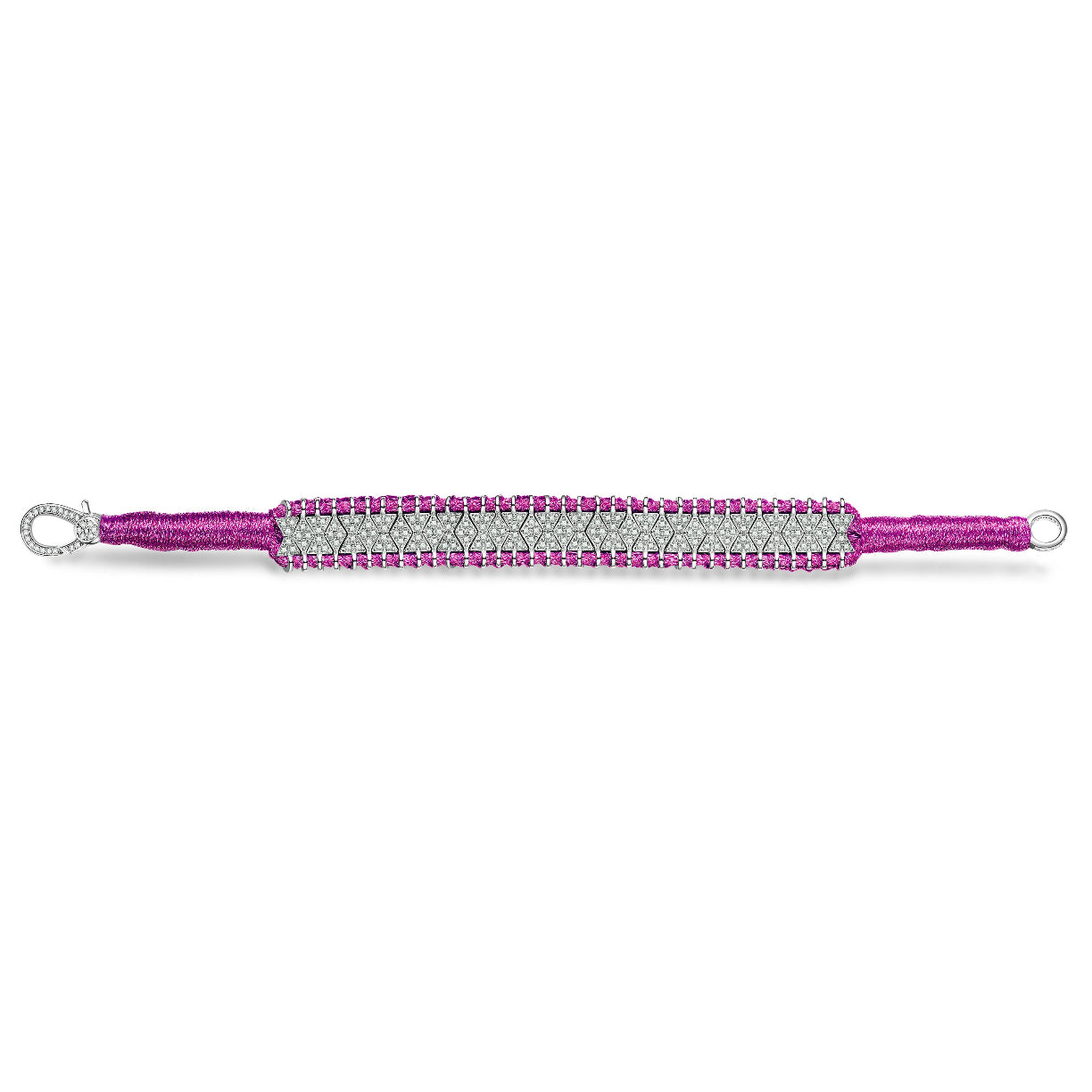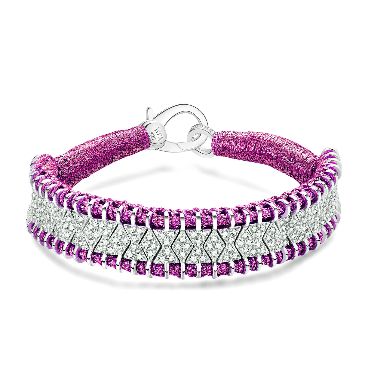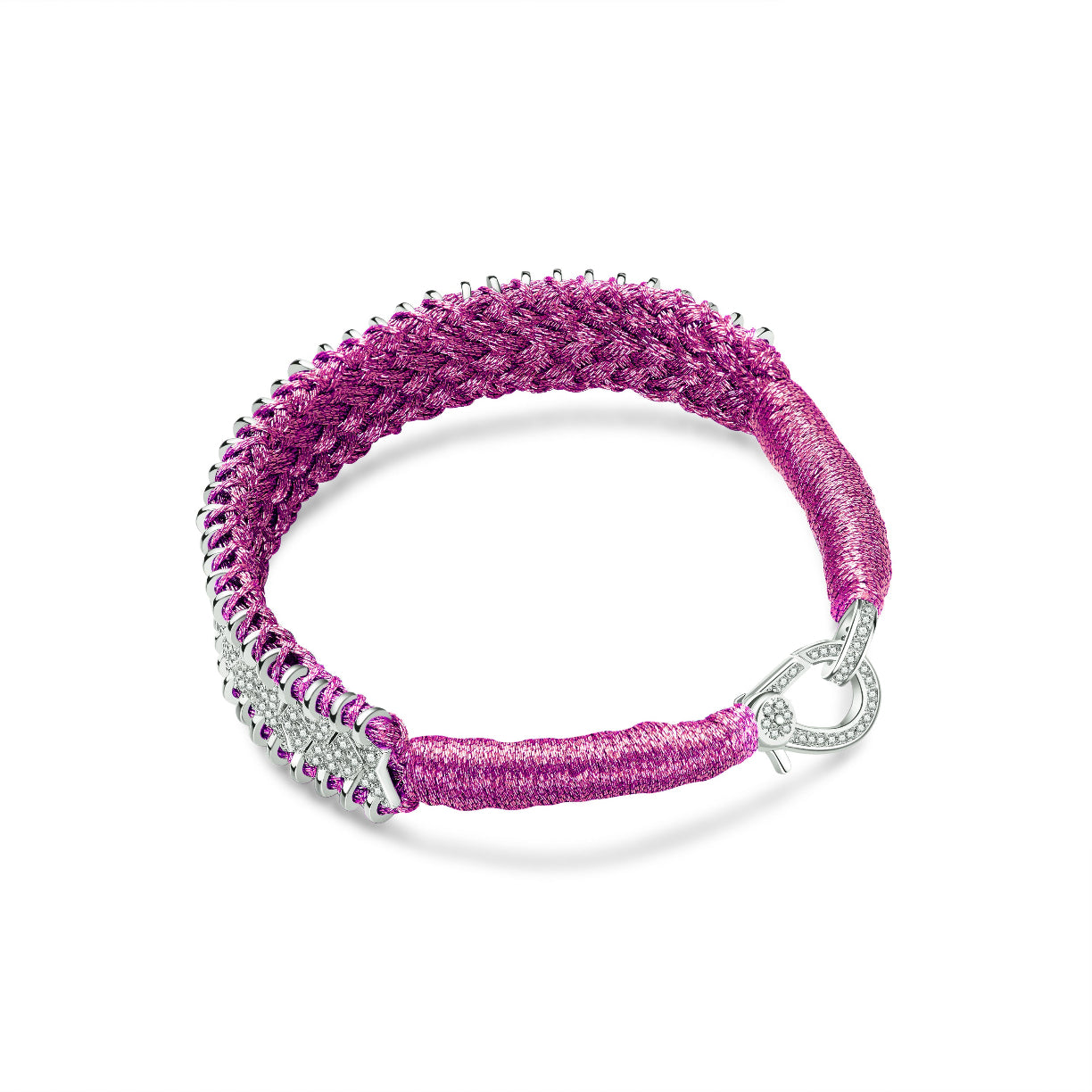 Bracelet in candy-colored braided lurex thread, decorated with a 925 silver pattern and set with a multitude of diamonds.