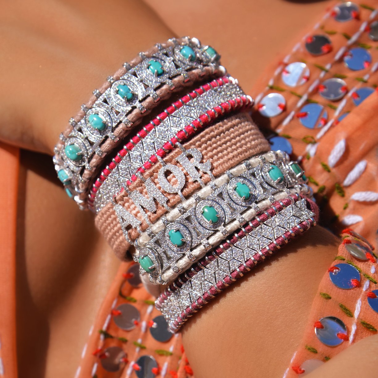This candy-colored thread bracelet will be your summer bohemian lucky charm. It is entirely decorated with silver forming diamonds alternating with hourglasses which compose a pattern chart. The silver structure is entirely set with diamonds, which gives this piece a definitely precious look that you will love.