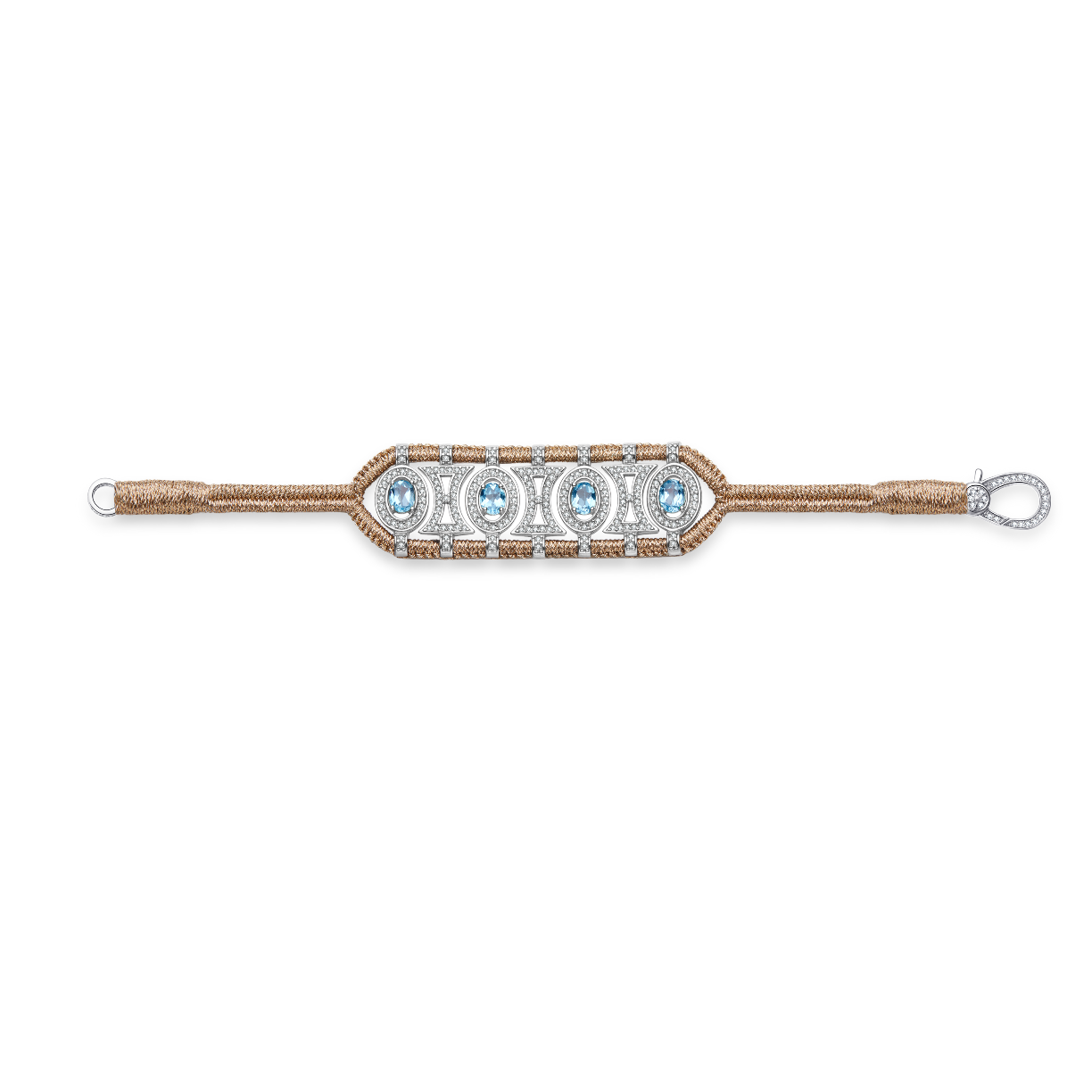 Openwork bracelet made of brass color braided lurex thread, adorned with a 925 sterling silver structure fully set with moissanites and enhanced with oval Swiss blue Topazes.