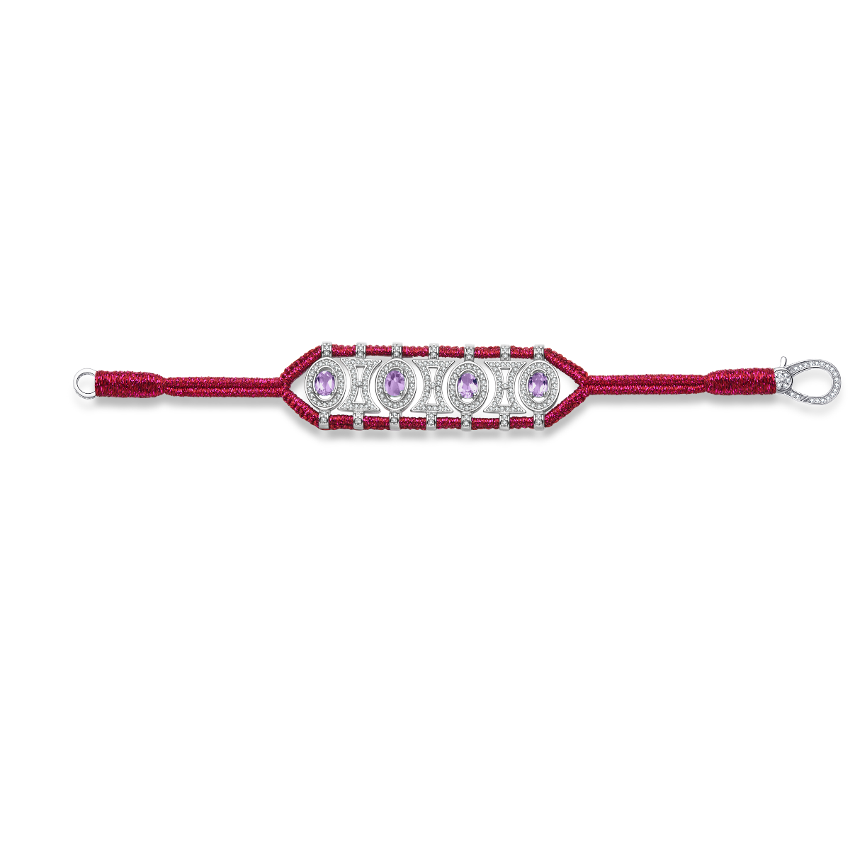 Openwork bracelet made of cherry red braided lurex thread, adorned with a 925 sterling silver structure fully set with moissanites and enhanced with oval amethysts.