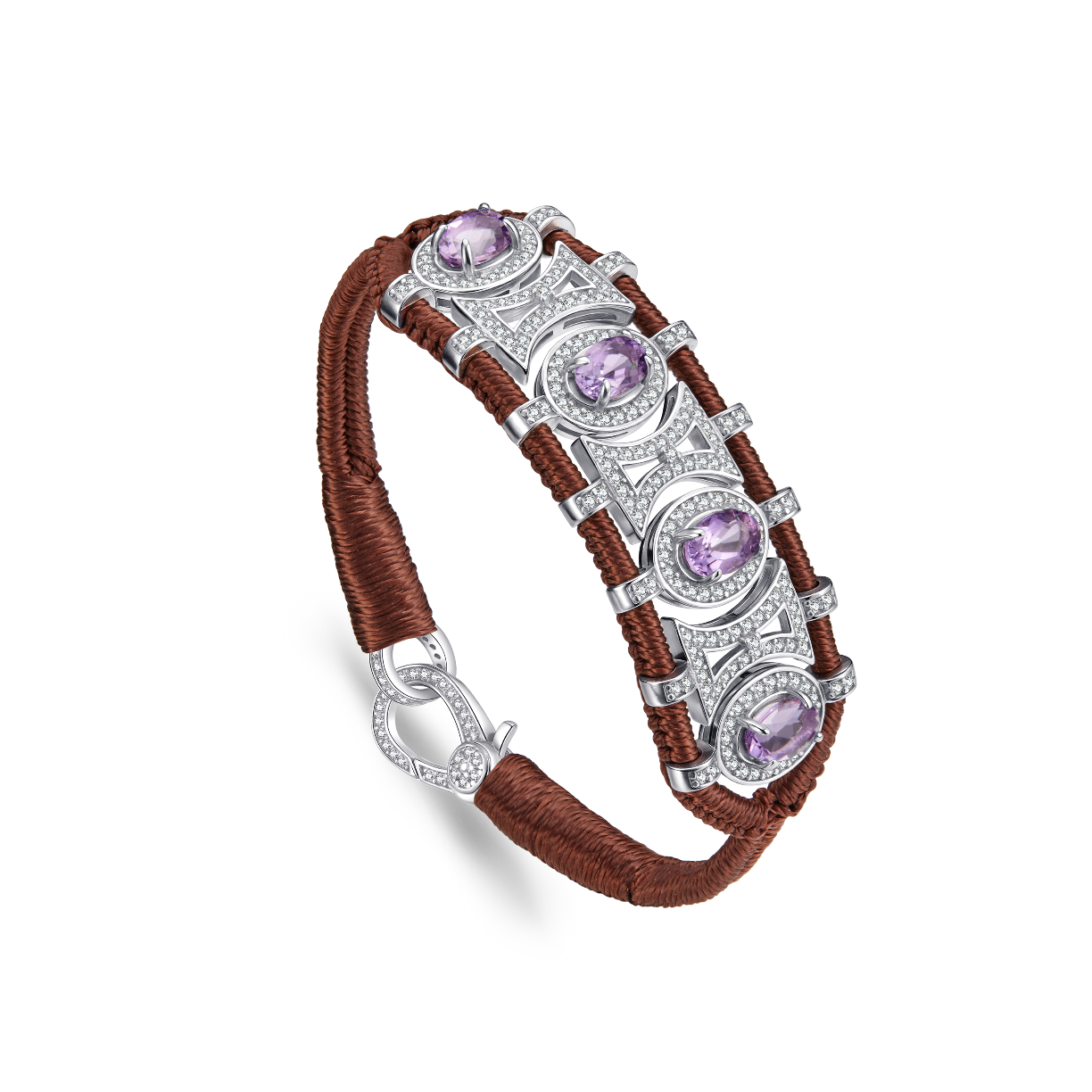 Openwork bracelet made of chocolate brown braided cotton thread, adorned with a 925 sterling silver structure fully set with moissanites and enhanced with oval amethysts.