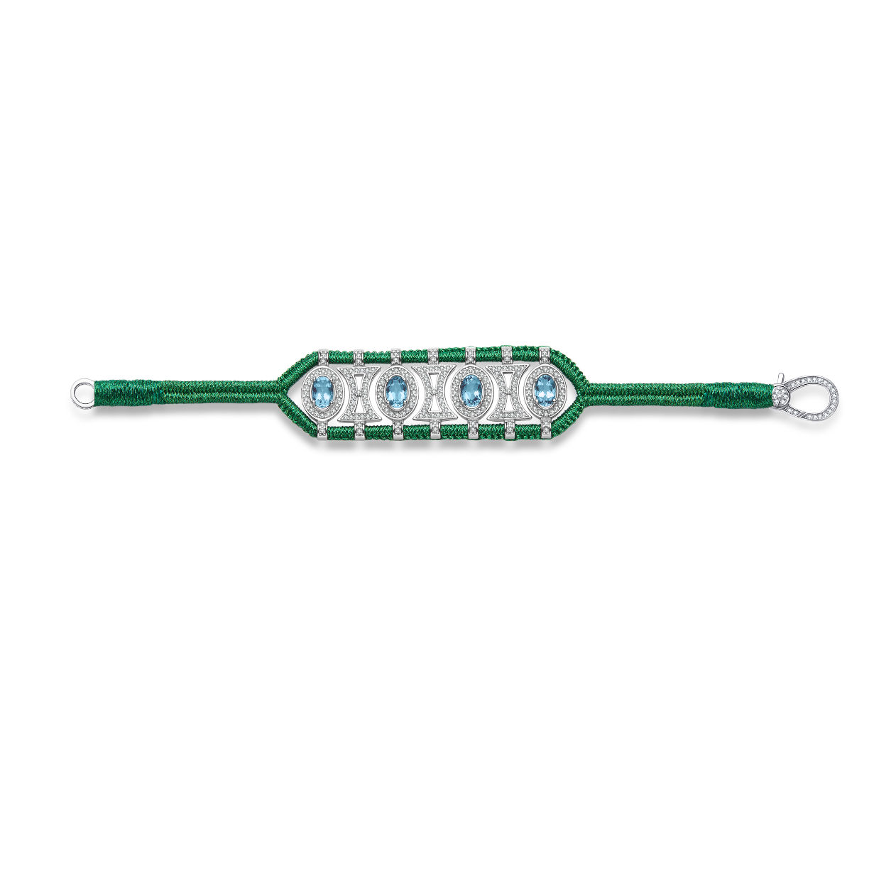 Openwork bracelet made of grass green braided lurex thread, adorned with a 925 sterling silver structure fully set with moissanites and enhanced with oval Swiss blue Topazes.