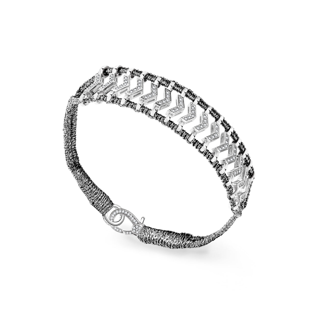 Fine bracelet in gun braided lurex thread, decorated with a 925 silver pattern and set with moissanites.