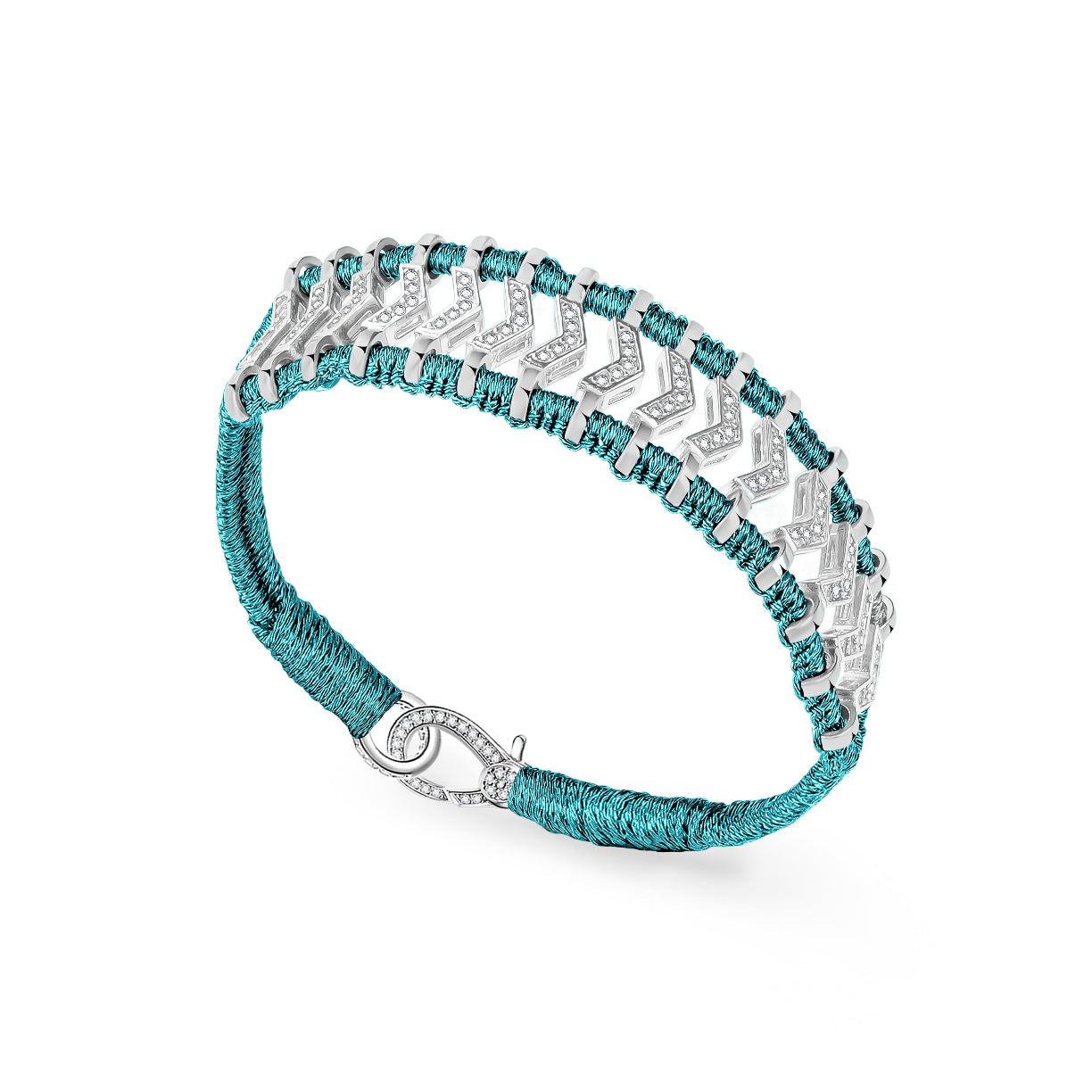 This bracelet in pacific thread color will beyour bohemian lucky summer. It is decorated with an openwork pattern in silver fully set with moissanites, which gives this piece a definitely precious look that you will love.