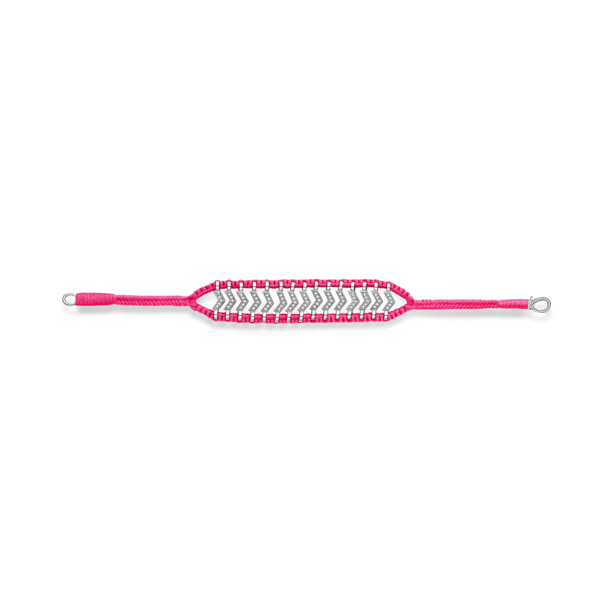 This bracelet in rani thread color will beyour bohemian lucky summer. It is decorated with an openwork pattern in silver fully set with moissanites, which gives this piece a definitely precious look that you will love.