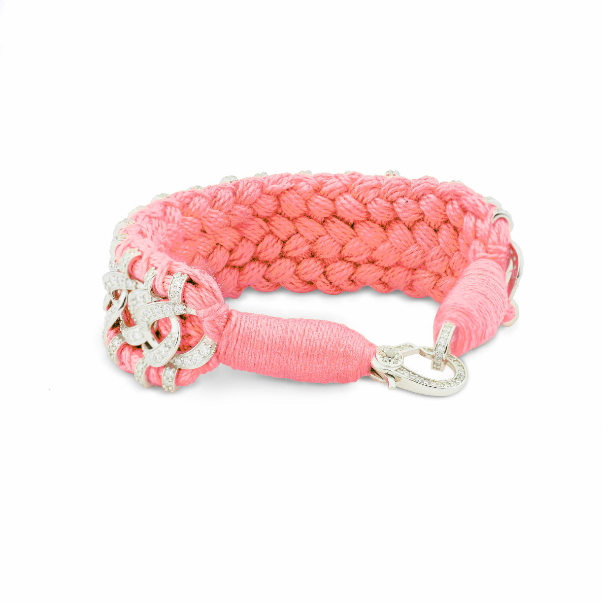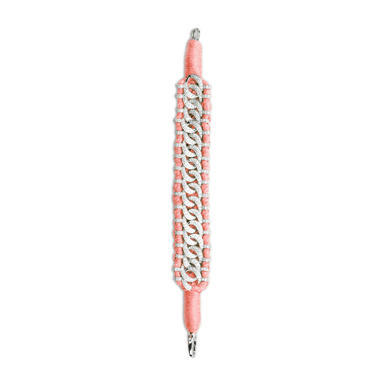 This sublime bracelet made of thread neon coral color and decorated with a silver motif resembling a chain with imposing links. The silver structure is set with more than 800 diamonds.