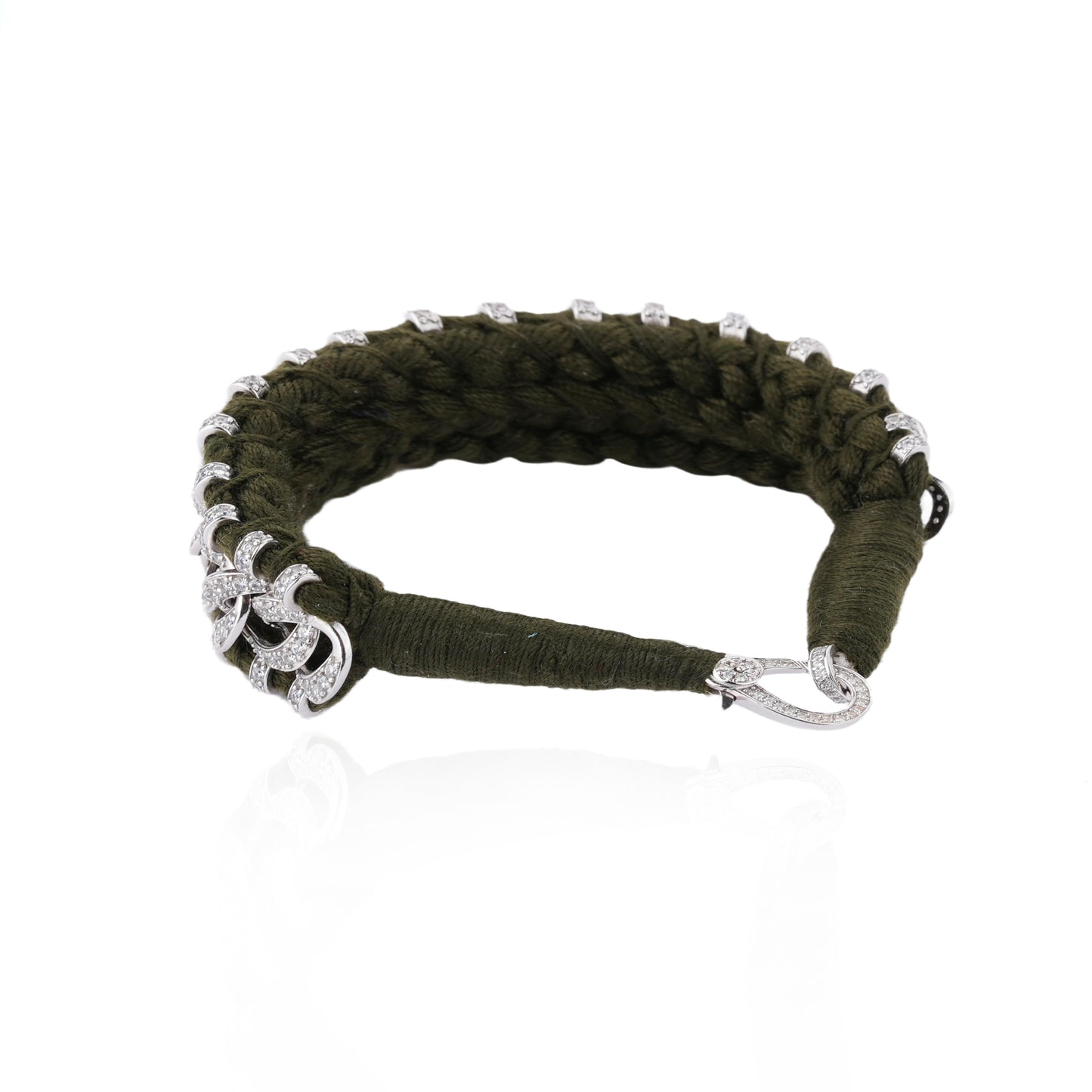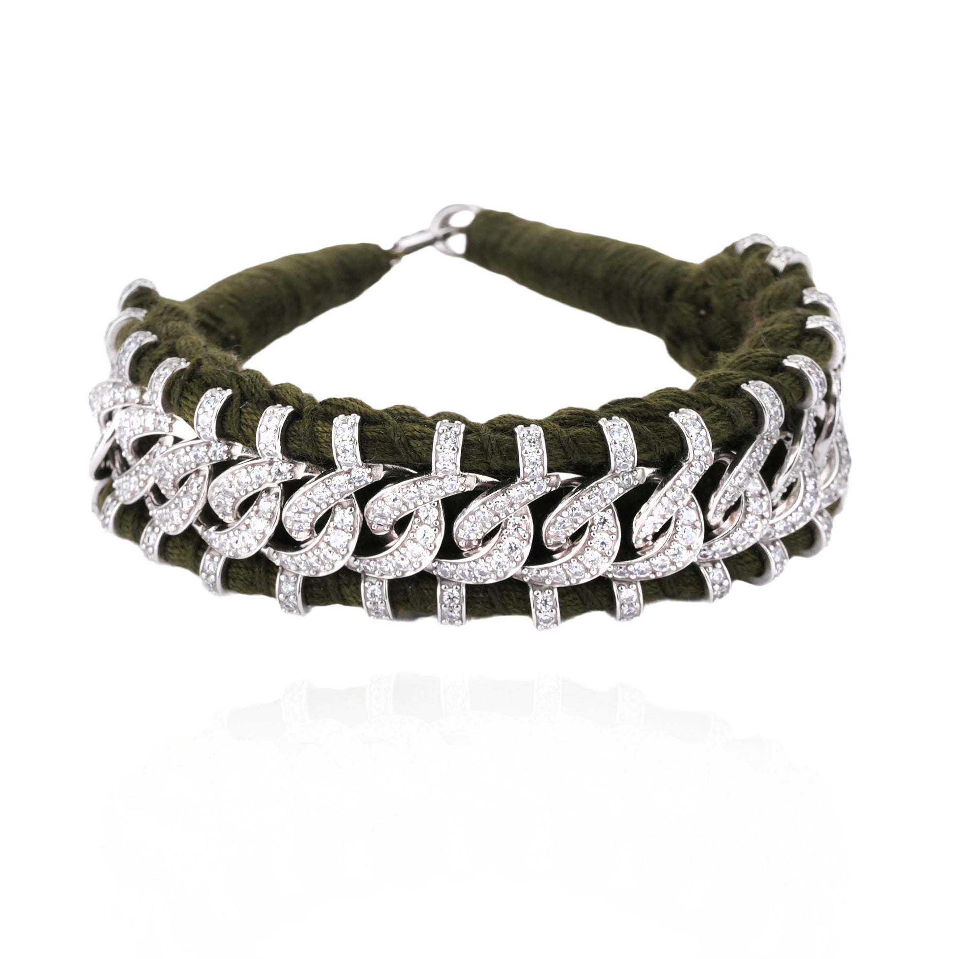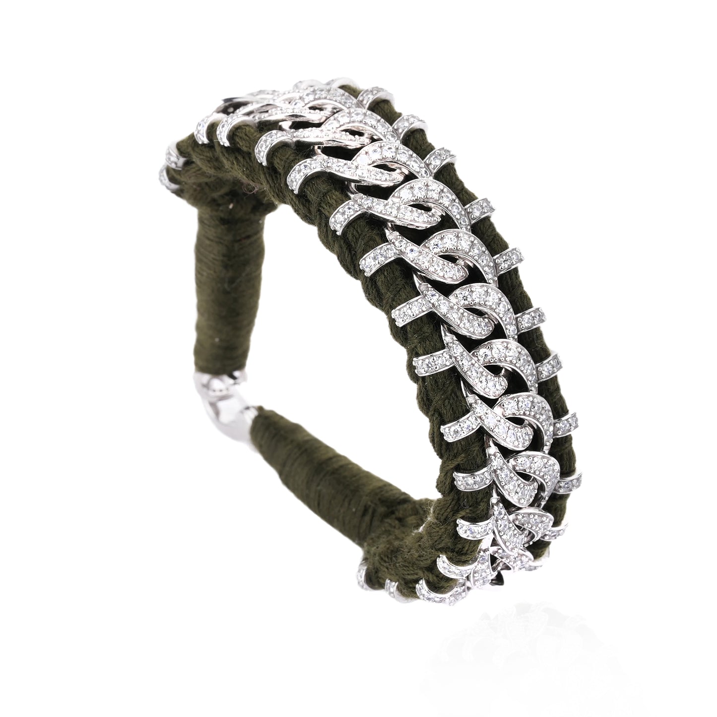 This sublime bracelet made of thread khaki color and decorated with a silver motif resembling a chain with imposing links. The silver structure is set with more than 800 diamonds.