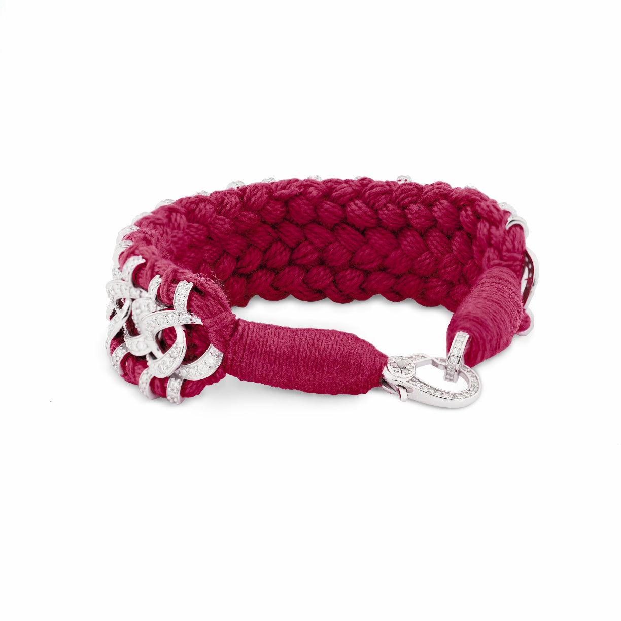 This sublime bracelet made of thread vine color and decorated with a silver motif resembling a chain with imposing links. The silver structure is set with more than 800 diamonds.