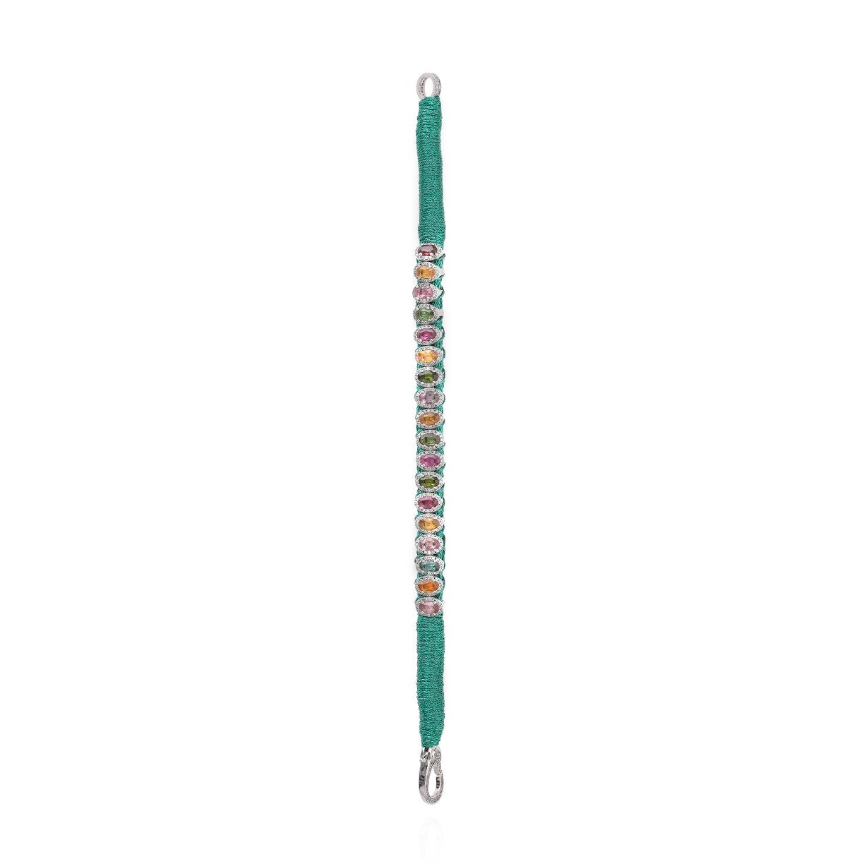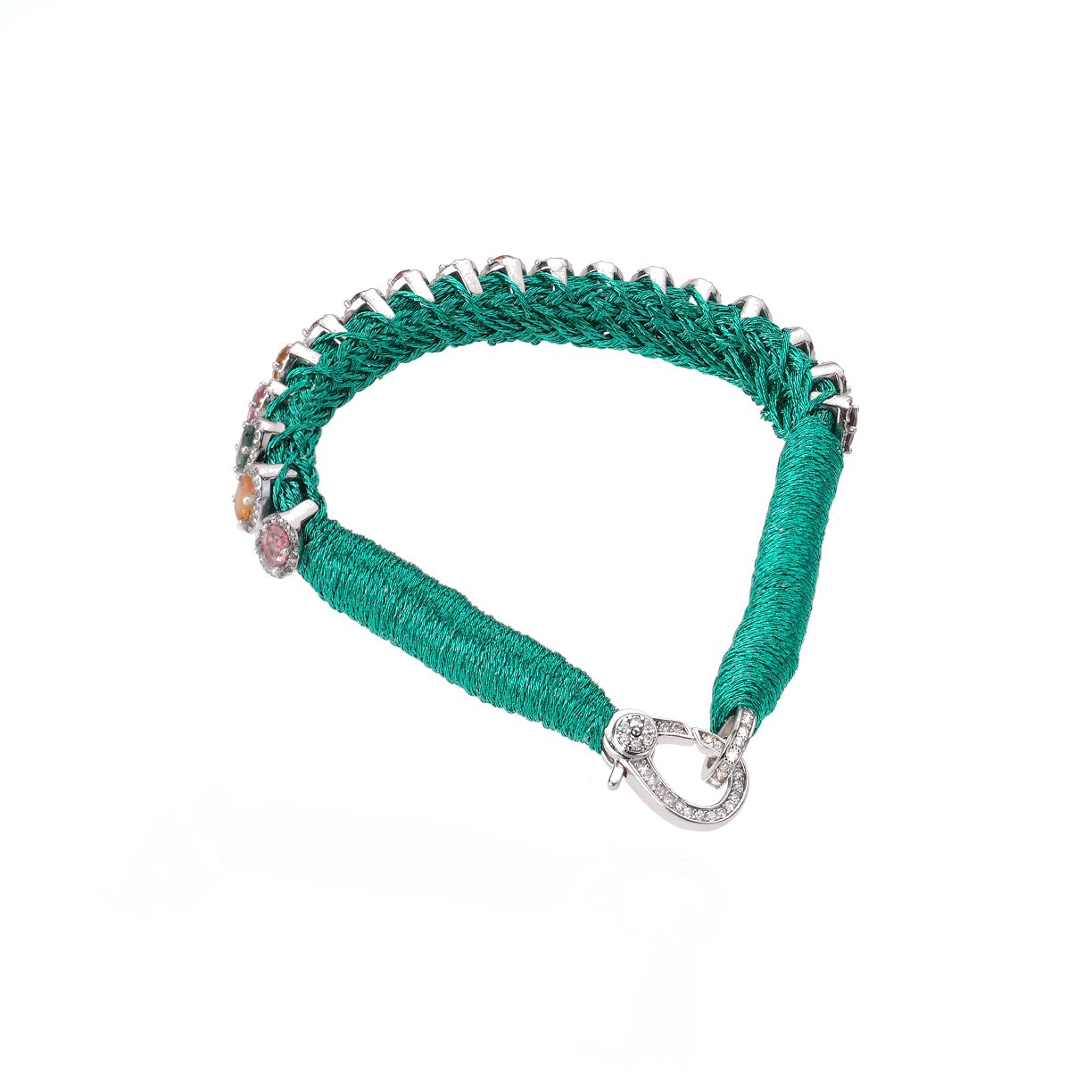 Thin bracelet in colored braided lurex thread emerald. It is decorated with multiple small silver ovals fully set with more than 200 diamonds and enhanced, in their center, with rainbow Tourmalines. An ethnic piece in the spirit of the famous Brazilian bracelets,