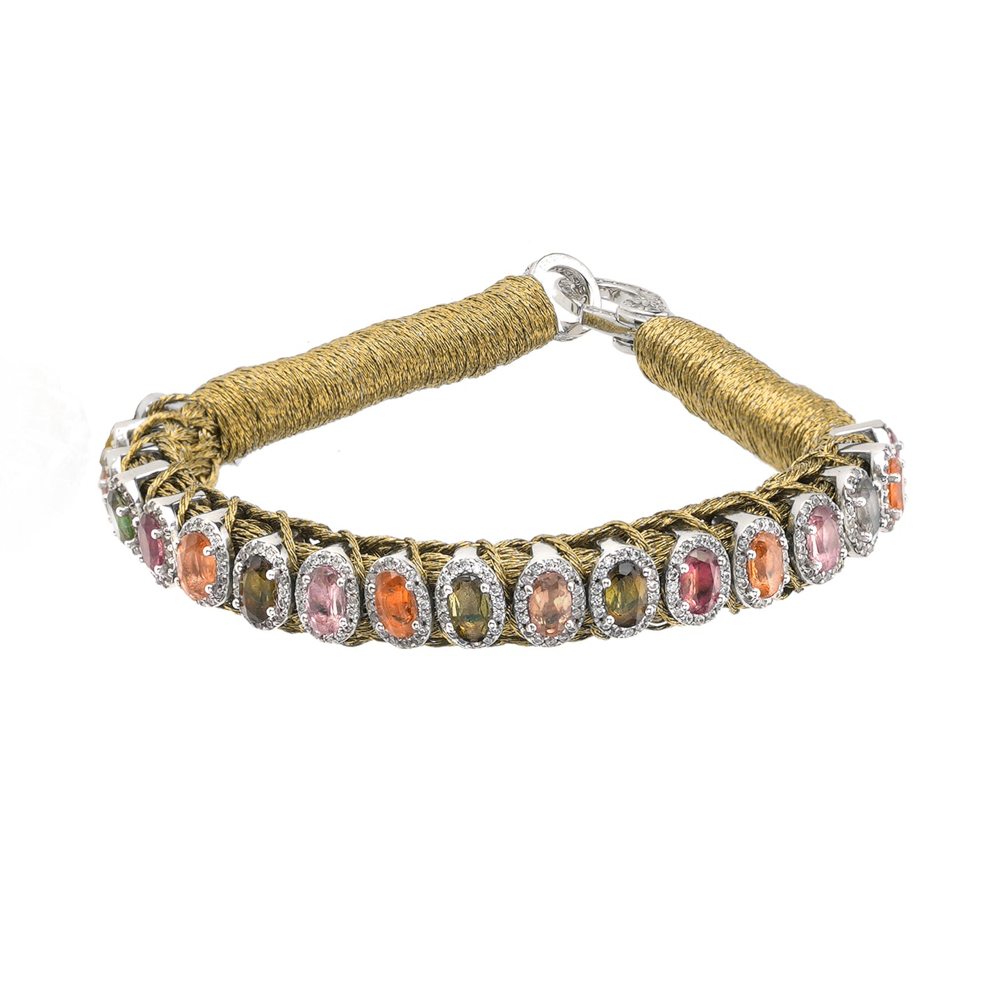 Bracelet in gold-colored braided lurex thread decorated with a 925 silver pattern and set with a multitude of diamonds . It is also decorated with splendid rainbow Tourmalines.