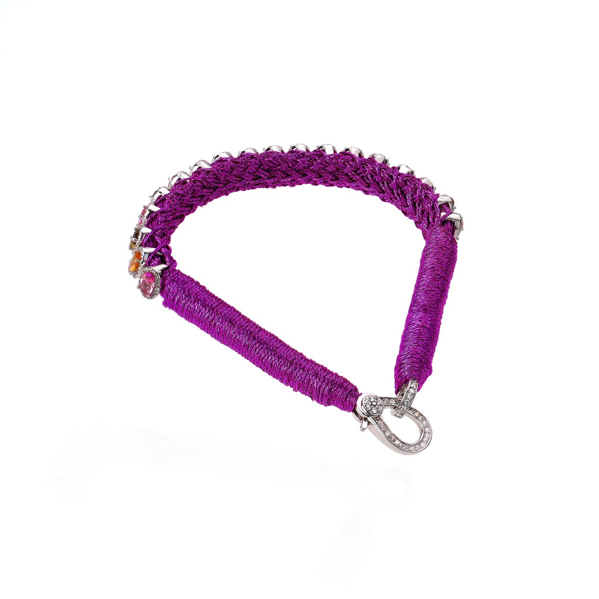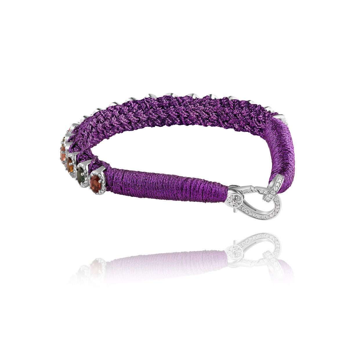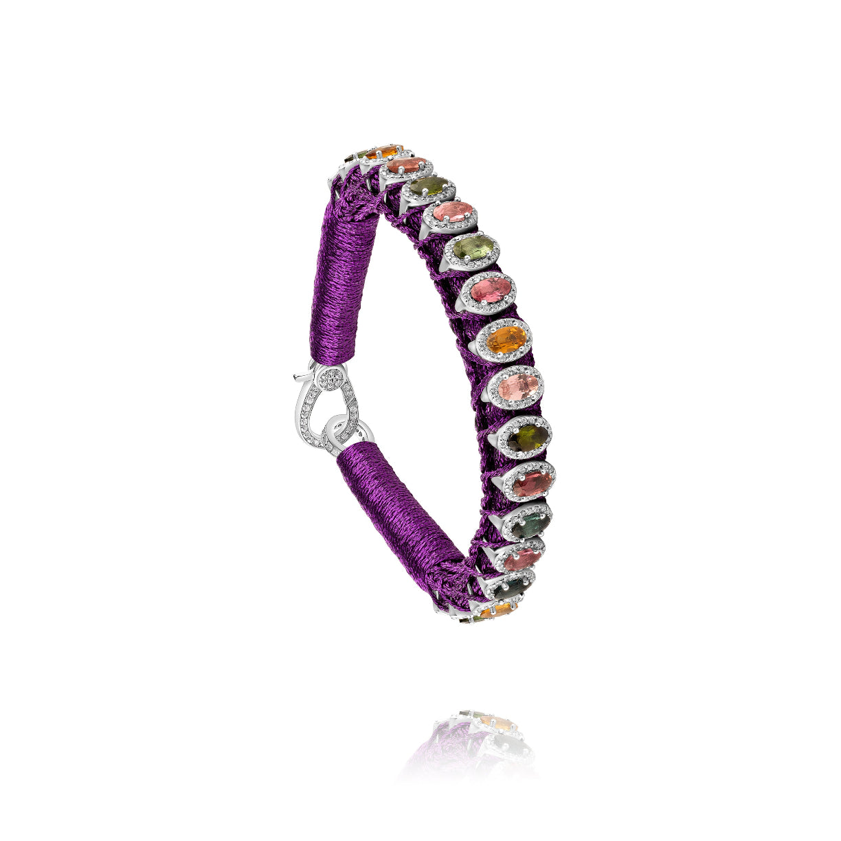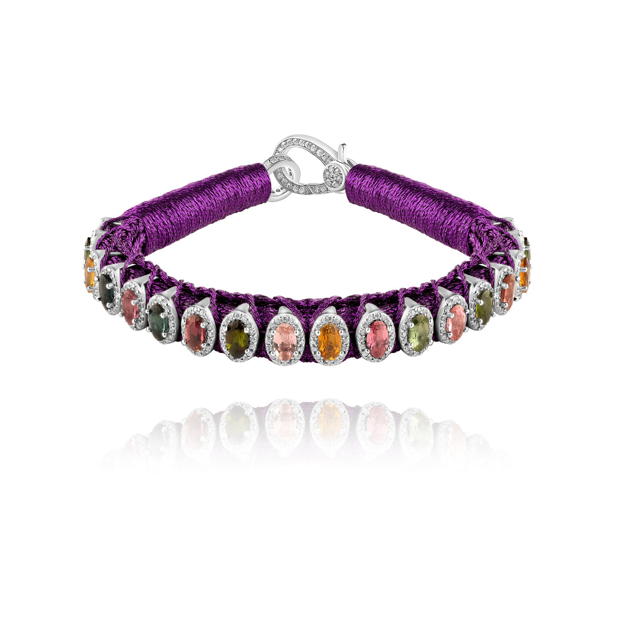 Thin bracelet in colored braided lurex thread iris. It is decorated with multiple small silver ovals fully set with more than 200 diamonds and enhanced, in their center, with rainbow Tourmalines. An ethnic piece in the spirit of the famous Brazilian bracelets,