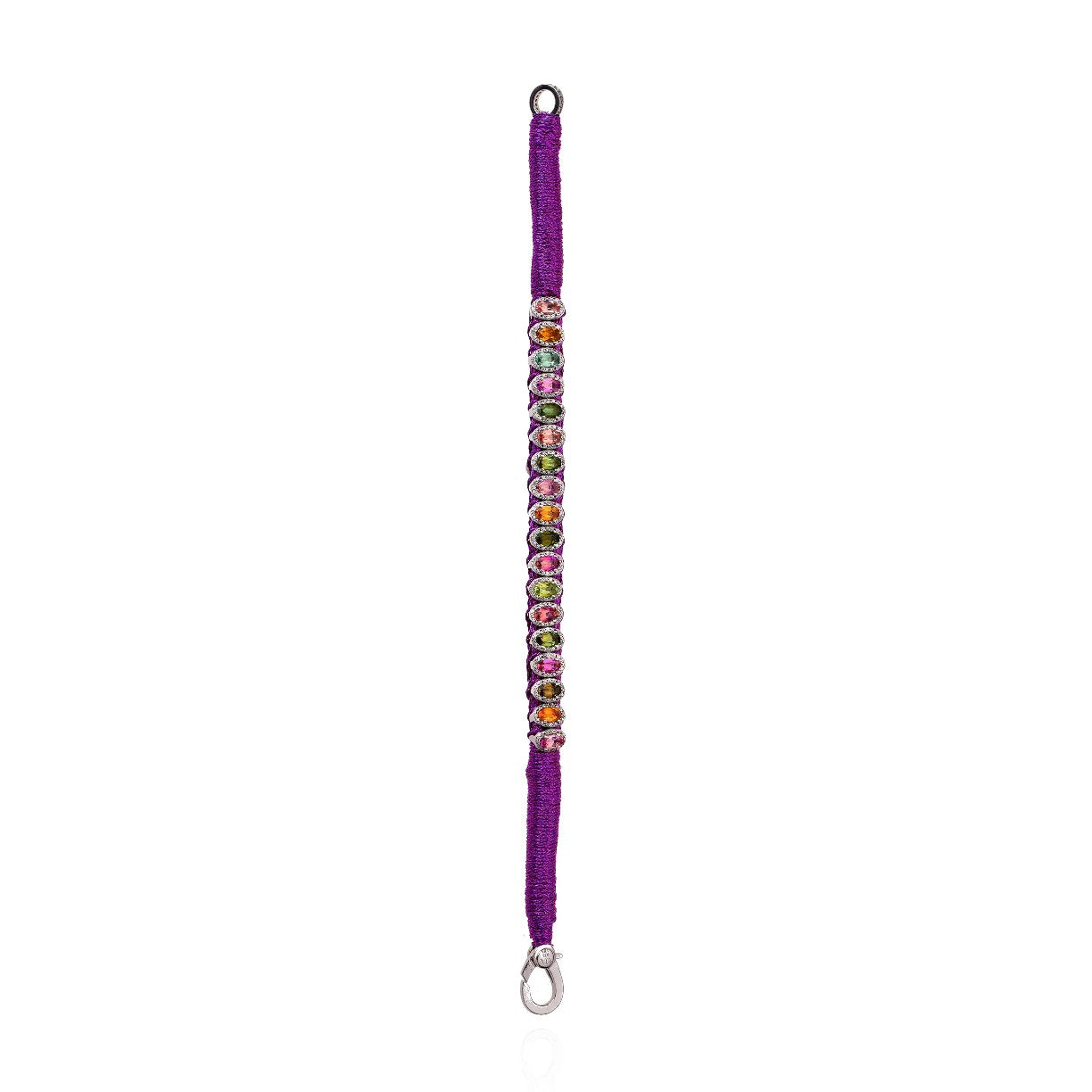 Bracelet in iris-colored braided lurex thread decorated with a 925 silver pattern and set with a multitude of diamonds. It is also decorated with splendid rainbow Tourmalines.