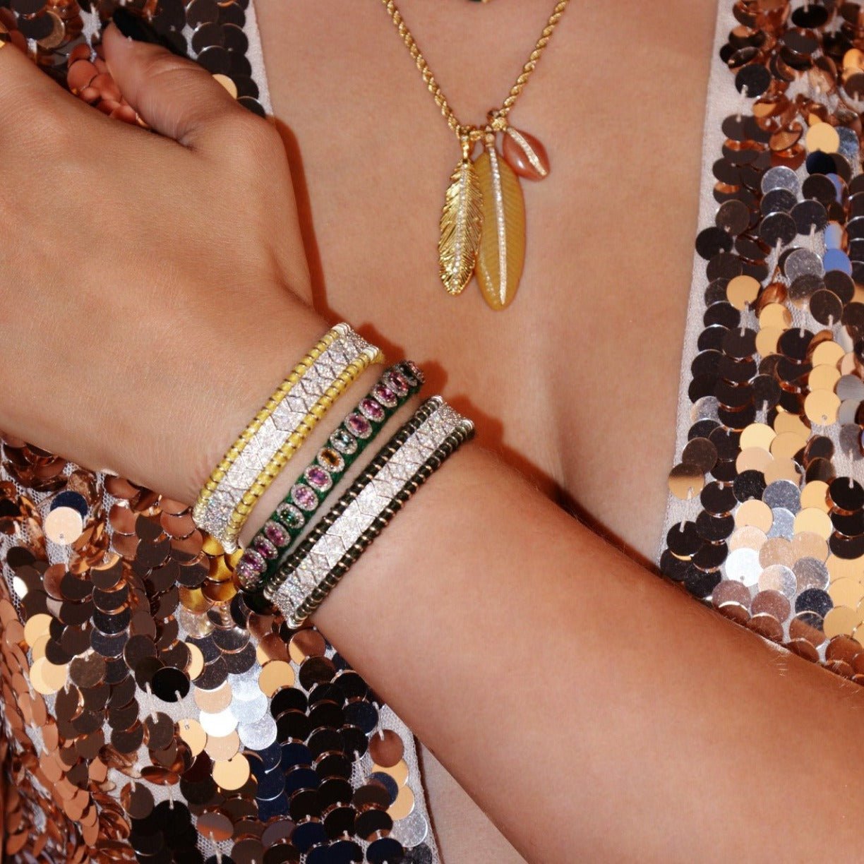 An ethnic piece in the spirit of the famous Brazilian bracelets, which the multiple diamonds and colored stones bring a refinement that will captivate you.