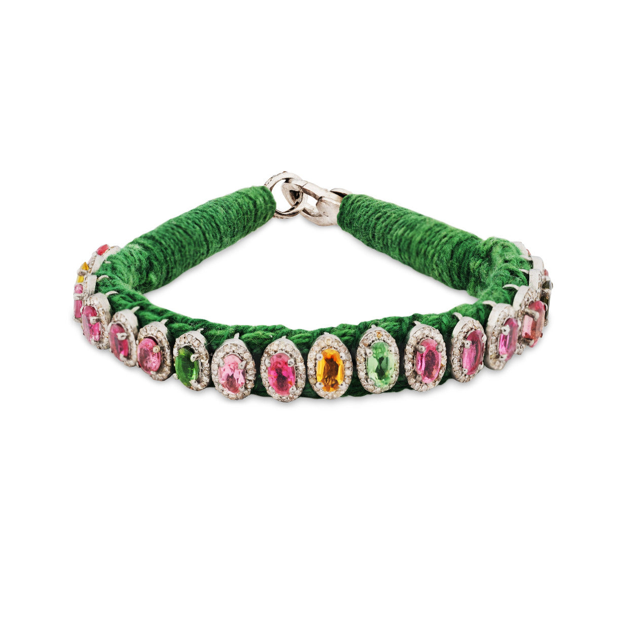 Thin bracelet in green braided cotton thread. It is decorated with multiple small silver ovals fully set with more than 200 diamonds and enhanced, in their center, with multicolored semi-precious stones.