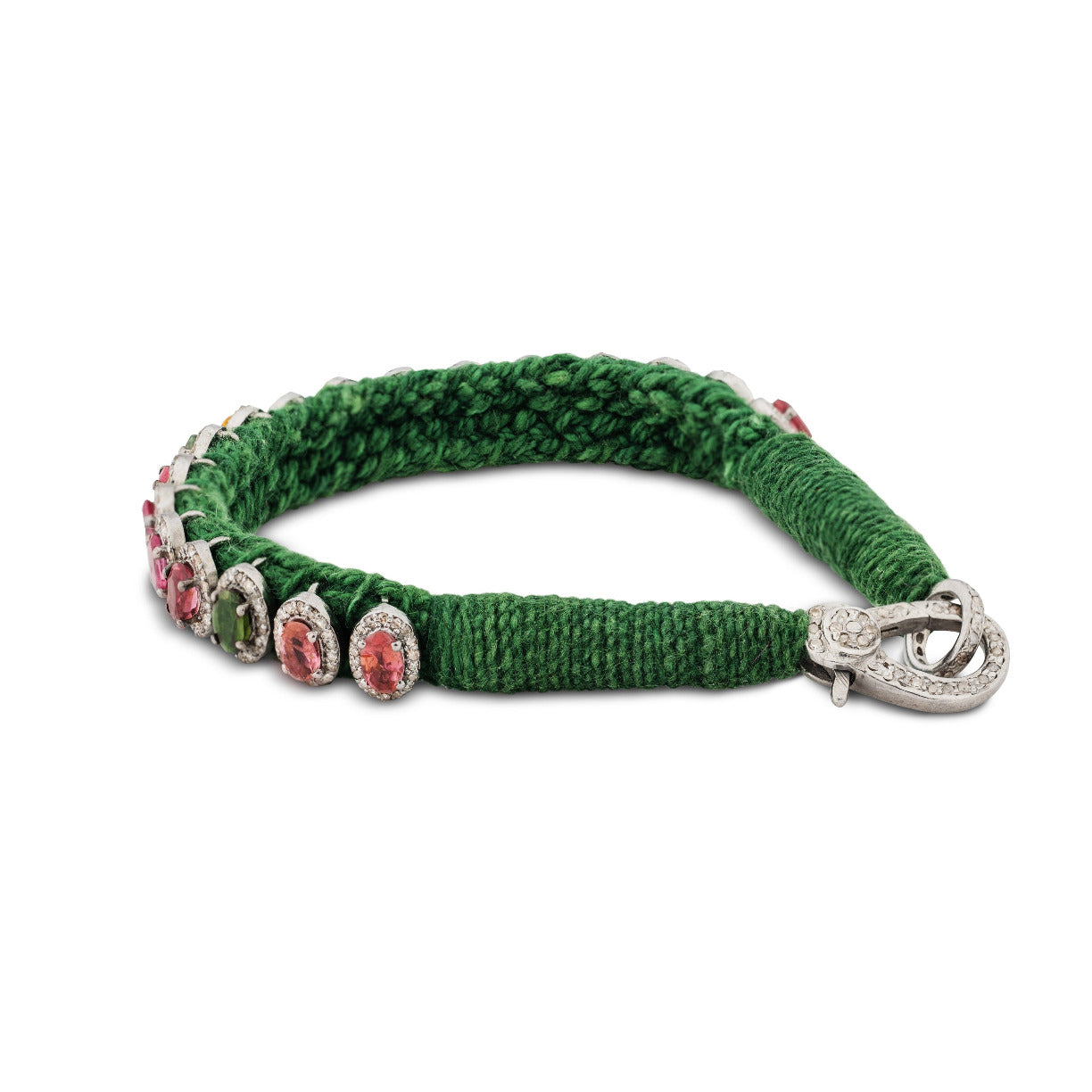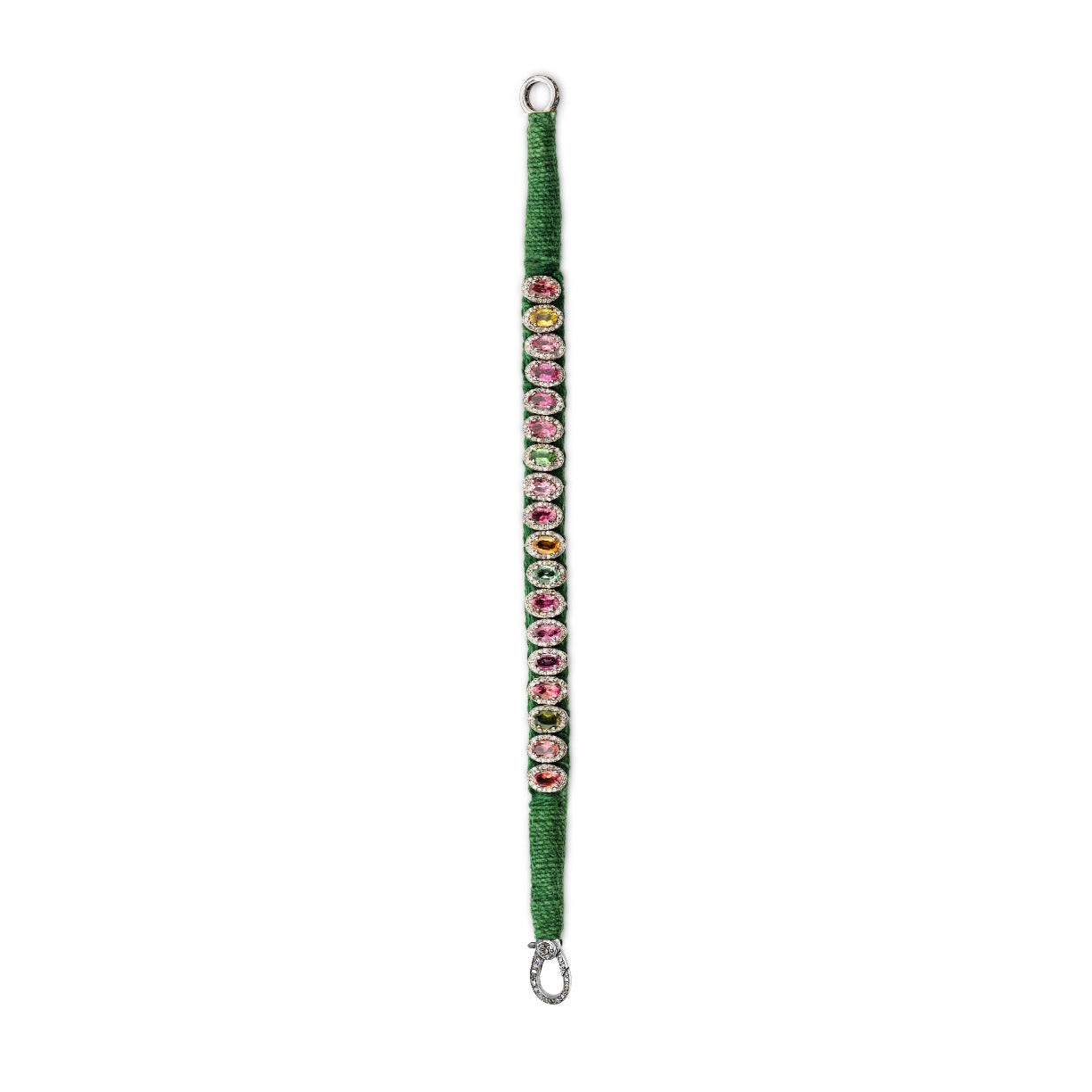 Green braided cotton thread bracelet decorated with a 925 silver pattern and set with a multitude of diamonds . It is also decorated with splendid rainbow Tourmalines.