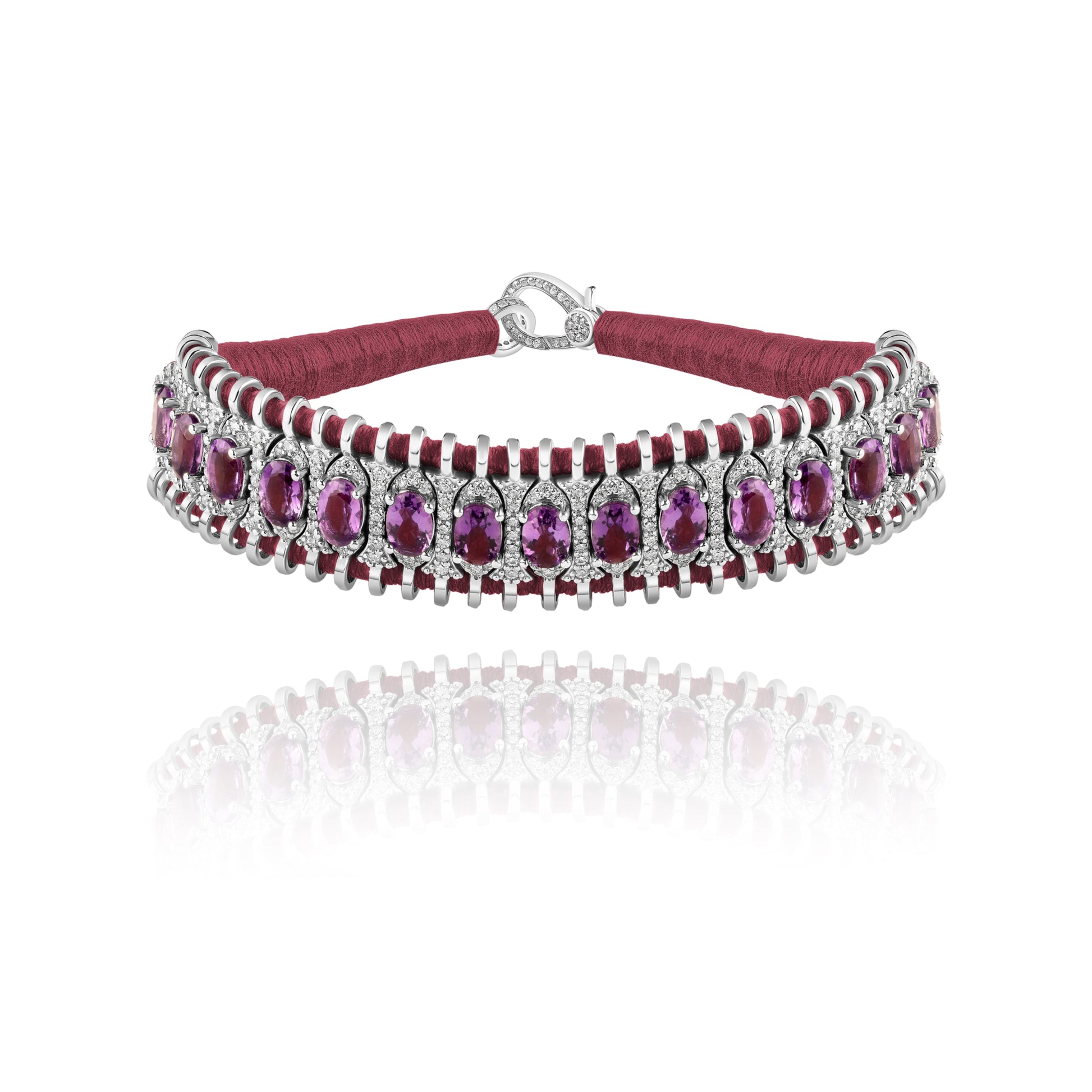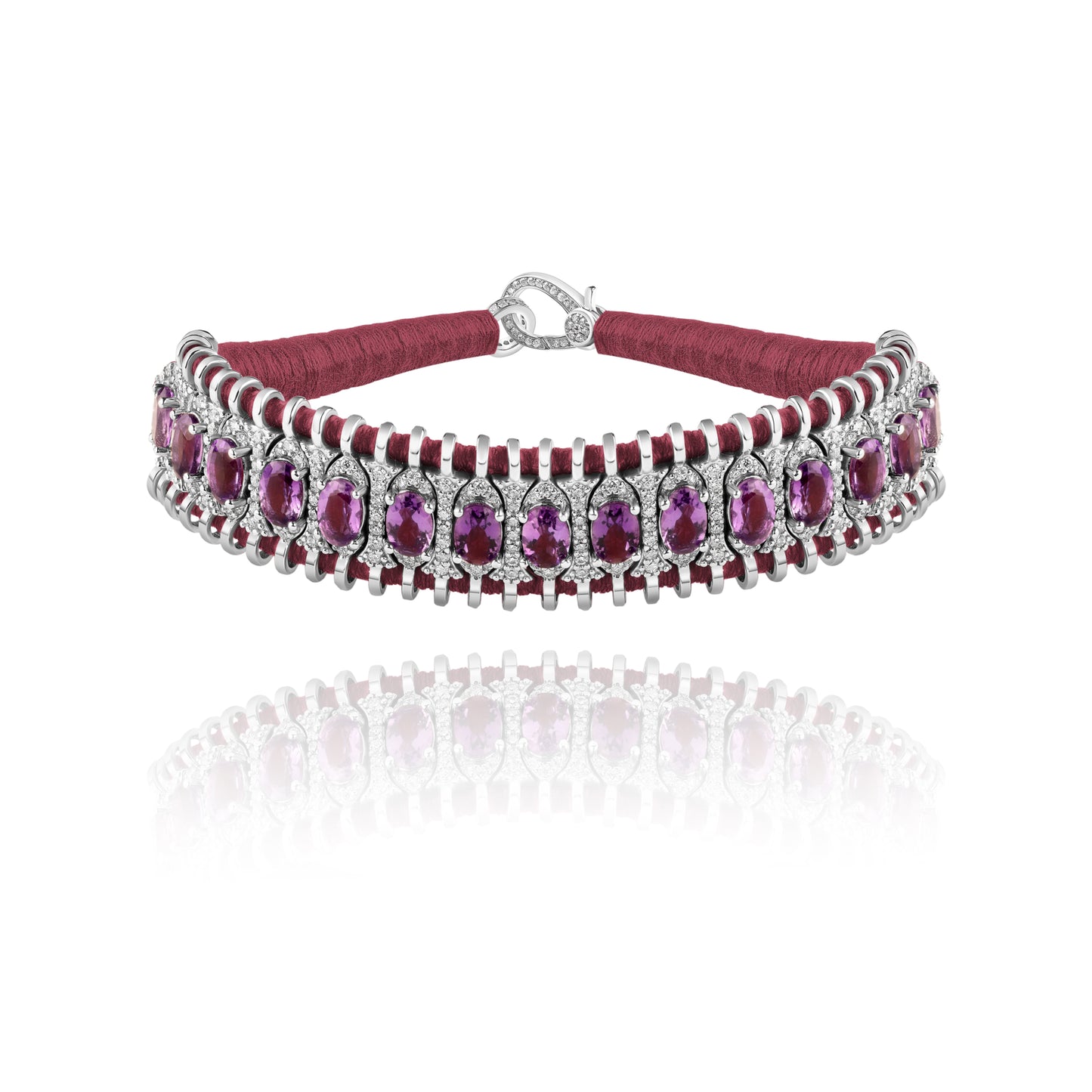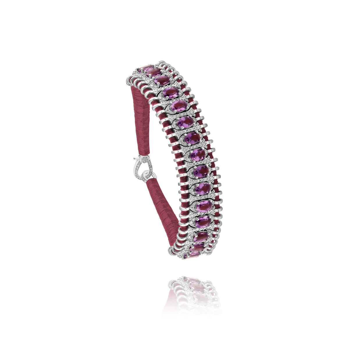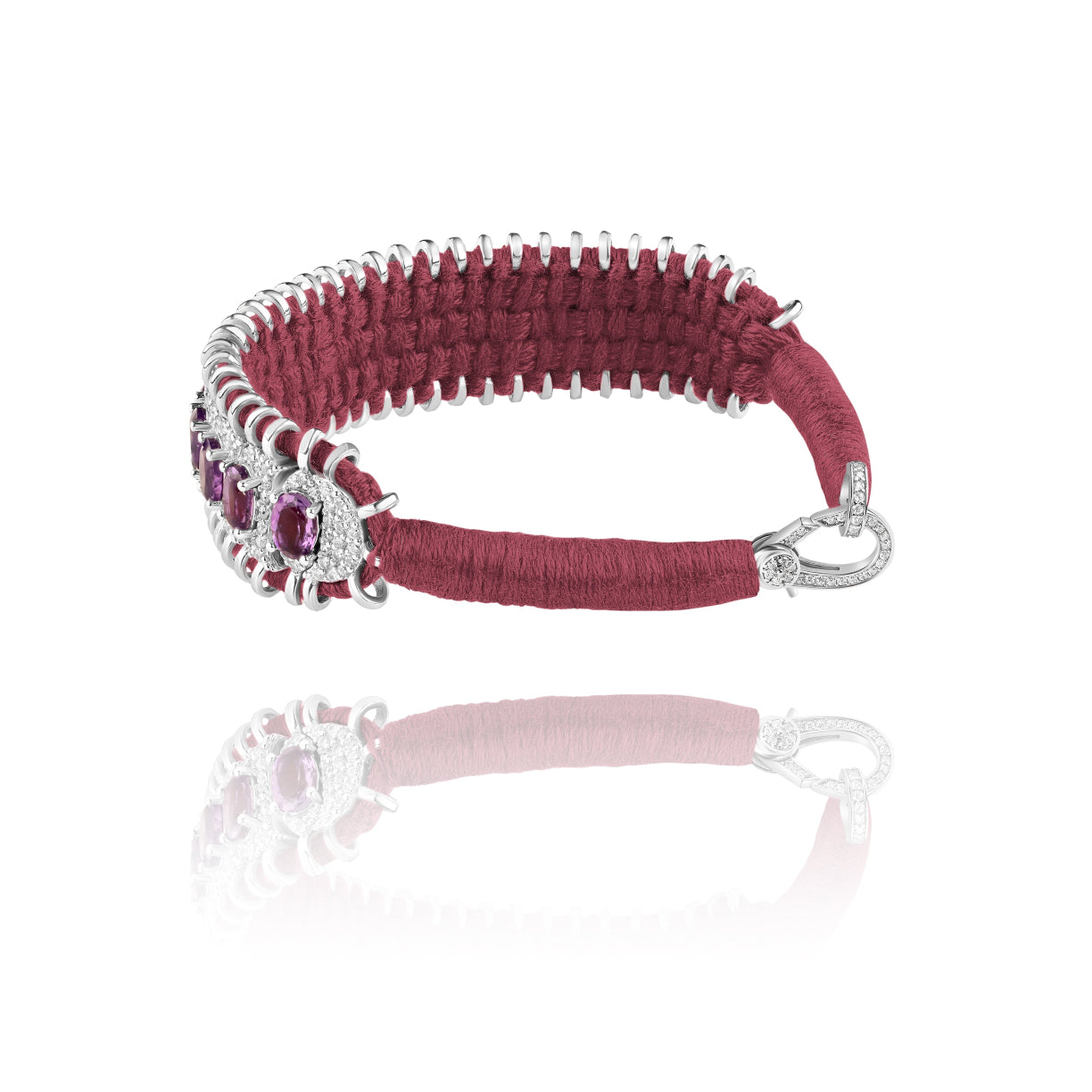 Bracelet in bamboo braided cotton thread adorned with a motif in silver 925 fully paved with diamonds and enhanced with amethysts.