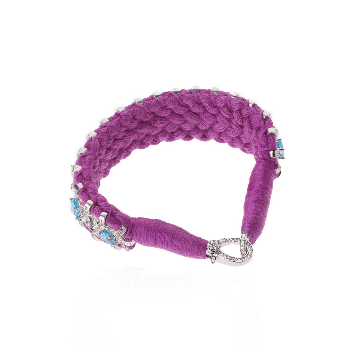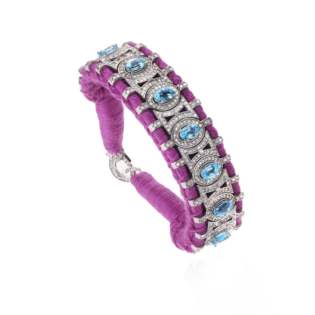 This thread bracelet purple color will be your bohemian lucky charm for the summer. It is entirely decorated with silver forming an oval pattern set with more than 300 diamonds. Each small oval is beautifully decorated with a central Topaz. It will forever be your friendship bracelet with its precious style and will never leave your wrist.