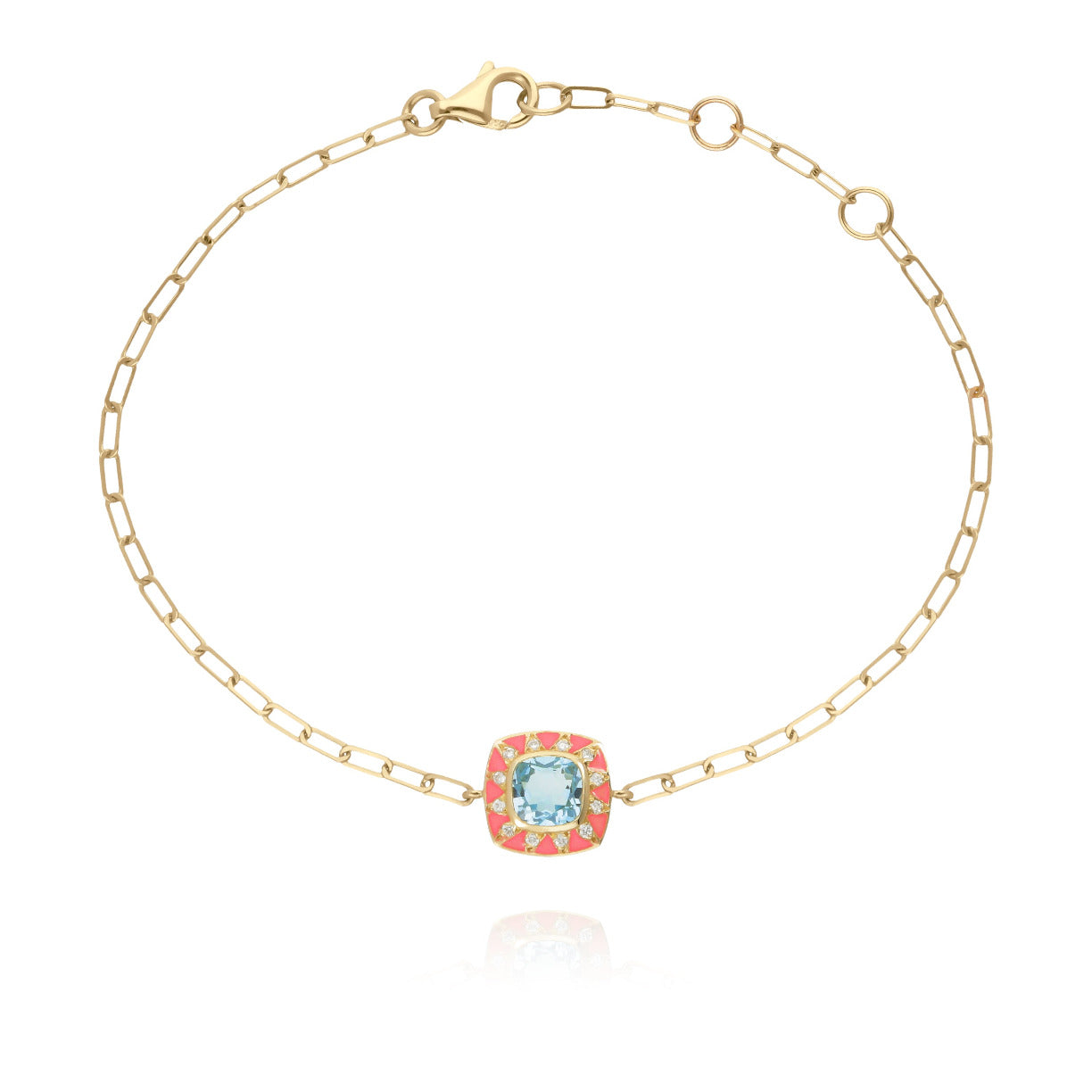 Bracelet in 18k yellow gold mounted on a chain with refined, oval links. It is adorned in its center with a delicate cabochon representing a star sparkling with diamonds around a sky blue topaz, and fluorescent coral enamel.