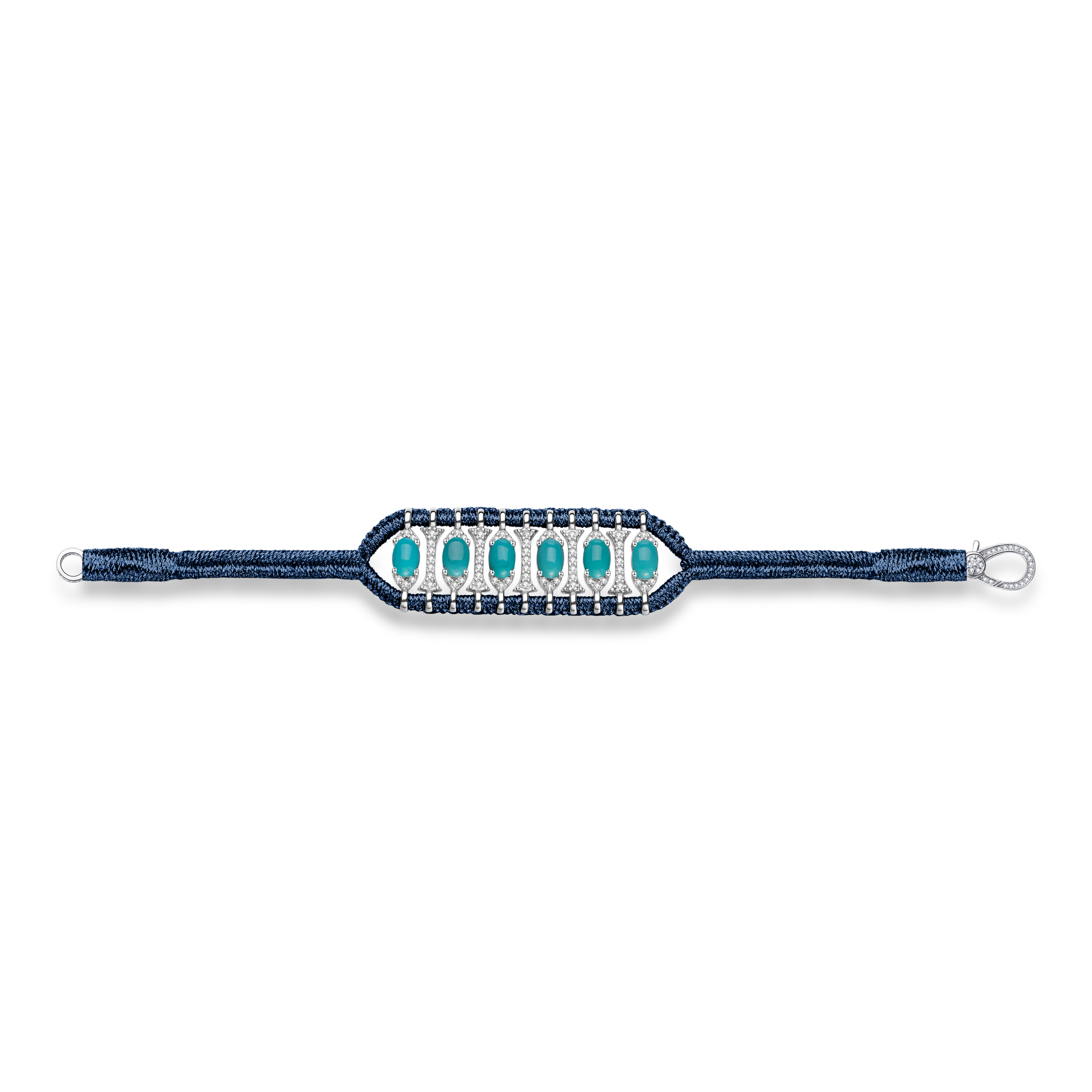 Bracelet in abyss braided lurex thread decorated with a motif in silver 925 entirely paved with moissanites and enhanced with Turquoises.