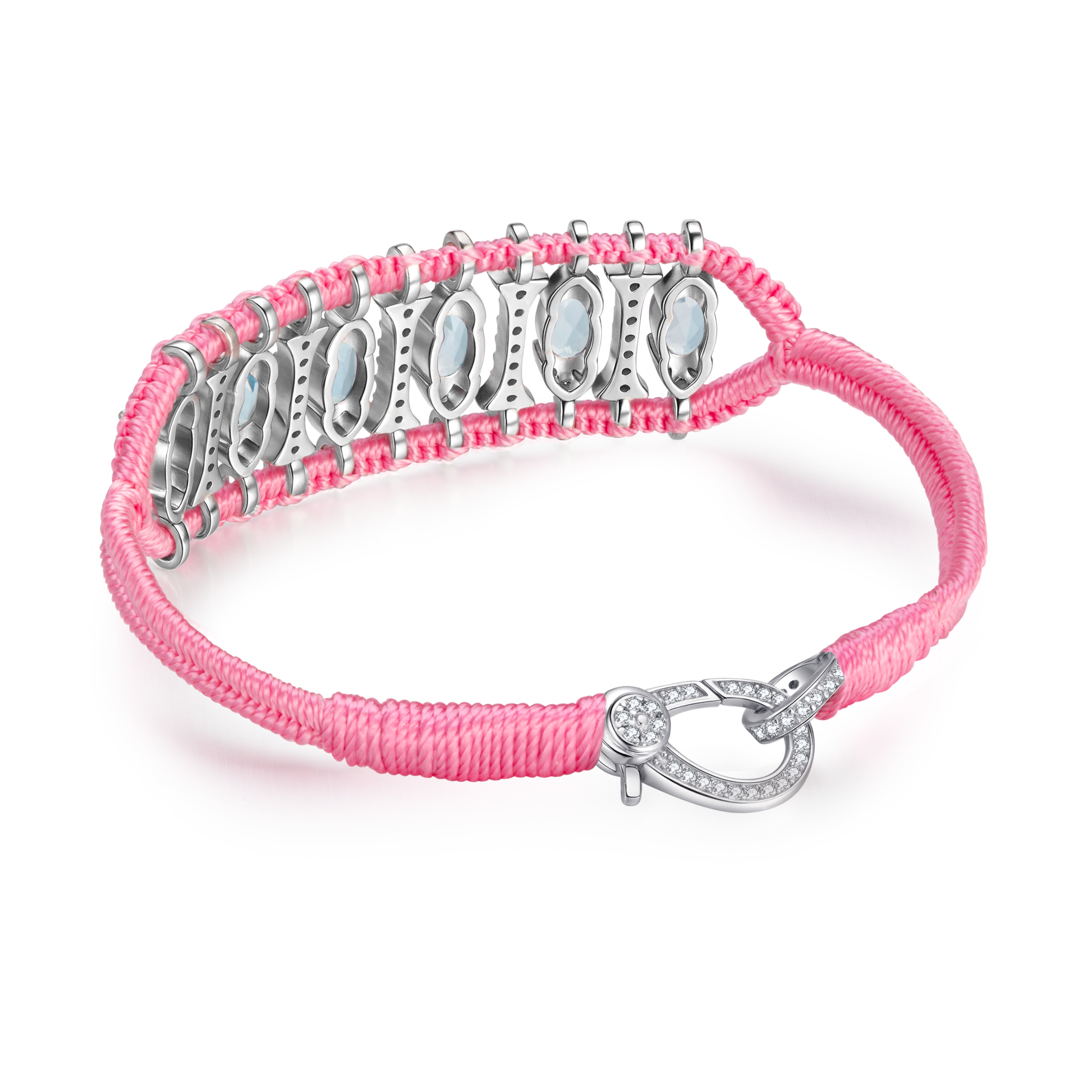 Bracelet in barbie cotton thread decorated with a motif in silver 925 entirely paved with moissanites and enhanced with blue Swiss topazes.