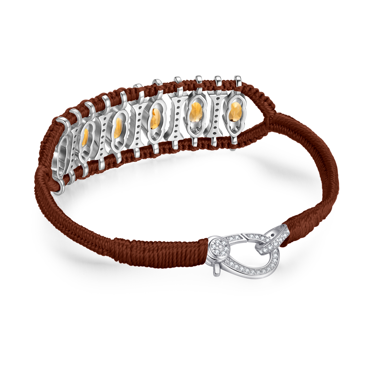 Bracelet in choco cotton thread decorated with a motif in silver 925 entirely paved with moissanites and enhanced with citrines.