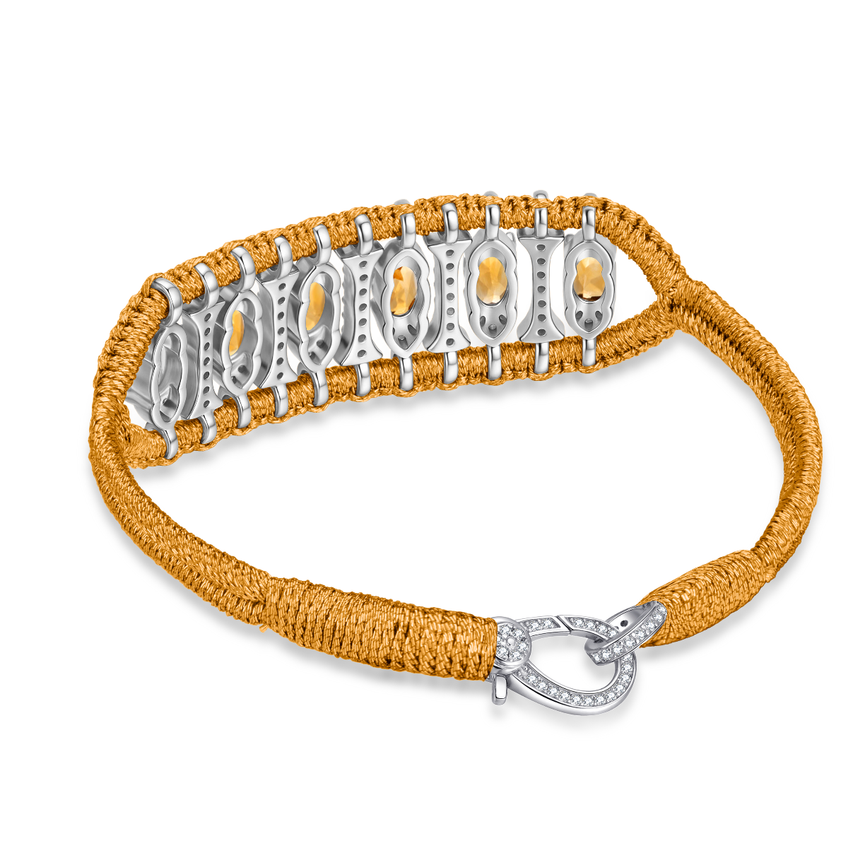 Bracelet in copper lurex thread decorated with a motif in silver 925 entirely paved with moissanites and enhanced with citrines.