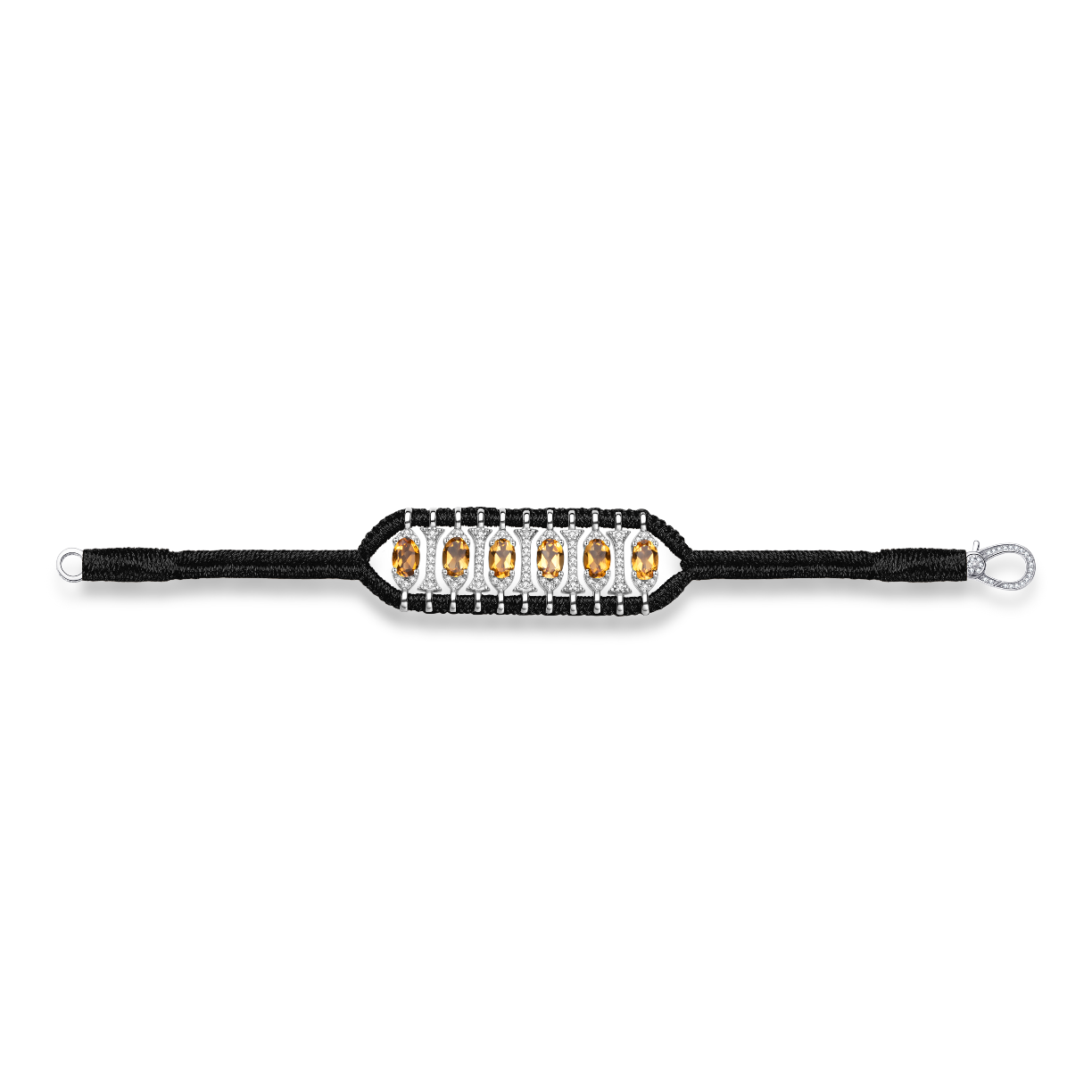 Bracelet in dark black braided lurex thread decorated with a motif in silver 925 entirely paved with moissanites and enhanced with citrines.