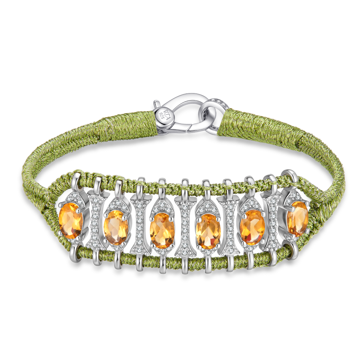 Bracelet in lime lurex thread decorated with a motif in silver 925 entirely paved with moissanites and enhanced with citrines.